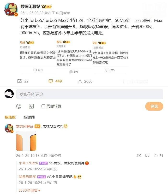 【9000mAh:消息称红米 REDMI Turbo 5 Max 手机配“粮系”今年上半年最大电池】 REDMI 红米手机官微宣布,REDMI Turbo 5 系列手机定档 1 月 29 日 19:00 发布。博主 数码闲聊站 今日发文透露,REDMI Turbo 5 / Turbo 5 Max 两款机型全系金属中框,配备 50Mp 简约竖排双摄。其中,REDMI Turbo 5 Max 有果味橙色,顶部有扬声器开孔,拥有旗舰级双扬声器,同时支持满级防水。该机还搭载天玑 9500s 处理器,内置 9000mAh 电池,博主表示,这就是“粮系”今年上半年的最大电池。REDMI 红米手机官方已发布 REDMI Turbo 5 Max 新色「阳光橙」的外观图。REDMI Turbo 5 Max 首发天玑 9500s 芯片,该处理器采用台积电 N3E 工艺:CPU:1*3.73GHz Cortex-X925 + 3*3.30GHz Cortex-X4 + 4*2.40GHz Cortex-A720GPU:Mali Immortalis-G925 MC12该机搭载小米澎湃 P3 充电芯片的“旗舰同款”100W 快充,以及最高 27W 反向充电,号称让手机秒变充电宝。此外,该机还实现 REDMI Turbo 系列首次兼容 100W PPS 协议。与此同时,雷军曾宣布该机首销送五年电池保,五年内系统电池健康度低于 80%,官方将免费更换。