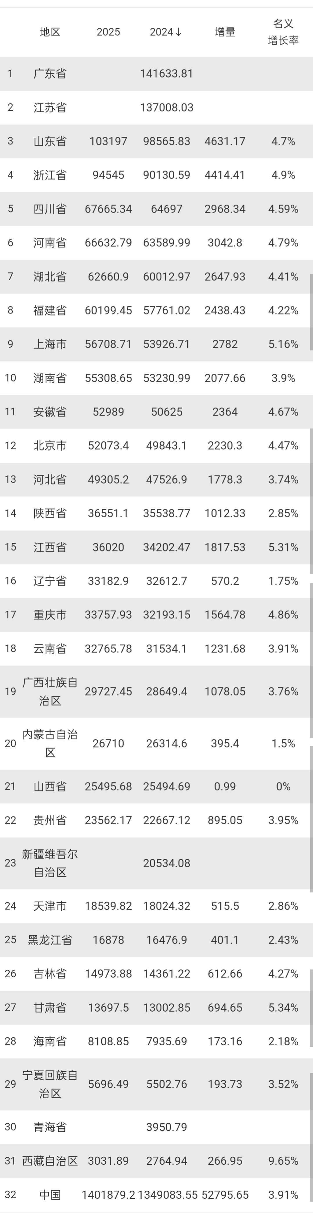28个省市2025年GDP出炉:湖南安徽差距缩小、重庆超辽宁 截止目前,我国31个省市中,广东、江苏和新疆暂未更新2025年GDP数据,其余28个省市2025年GDP数据都已经更新出炉了,西藏名义增速最高,同比增长9.65%,山西省处于垫底,同比增长0%。 河南2025年GDP实现66632.79亿,较2024年增加了3042.8亿,河南省经济增量仅次于山东省和浙江省,暂居全国第三名,不仅缩小了与四川省的经济差距,还扩大了对湖北省的经济领先优势。 湖南和安徽同为中部省份,2025年GDP分别实现55308.65亿和52989亿,较2024年分别增加了2077.66亿和2364亿,湖南经济增量低于安徽,导致对安徽的经济领先优势缩小至2319.65亿。 重庆和辽宁分别实现33757.93亿和33182.9亿,较去年分别增加了1564.78亿和570.2亿,辽宁经济增量低于重庆,导致经济总量被重庆反超575.03亿。