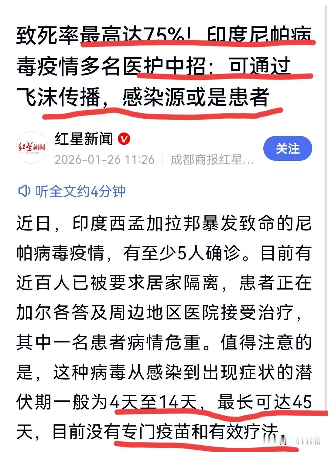 警惕!印度尼帕病毒爆发,致死率最高75%… 印度西孟加拉邦尼帕疫情突发,已确诊5例(含多名医护人员),1人危重,已有近百人被隔离,疑似源头患者还未检测就已经离世,明确出现医院内人传人… 这病毒天然宿主为果蝠,无特效药无疫苗,致死率40%-75%,潜伏期最长45天,感染后易引发脑炎甚至昏迷。 目前泰国、尼泊尔已全面升级防控,对印度该地区入境旅客严查体温、填写健康申报表,印度当地也对蝙蝠采样检测、严控医院感染。 近期有印度出行计划的朋友务必警惕,远离果蝠及生食水果,做好个人防护!