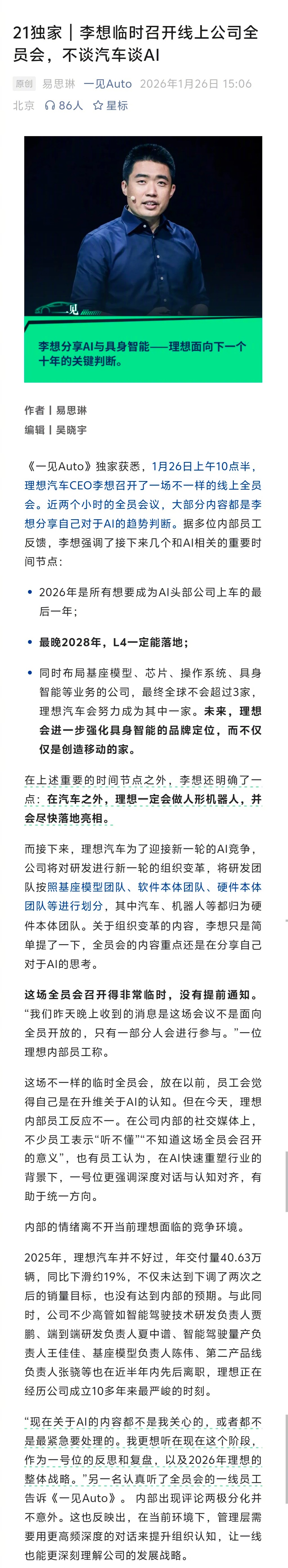 理想也要更进一步AI化了。李想本人谈:最晚2028年,L4一定落地。强化具身智能品牌定位。理想一定会做人形机器人,且尽快落地亮相。