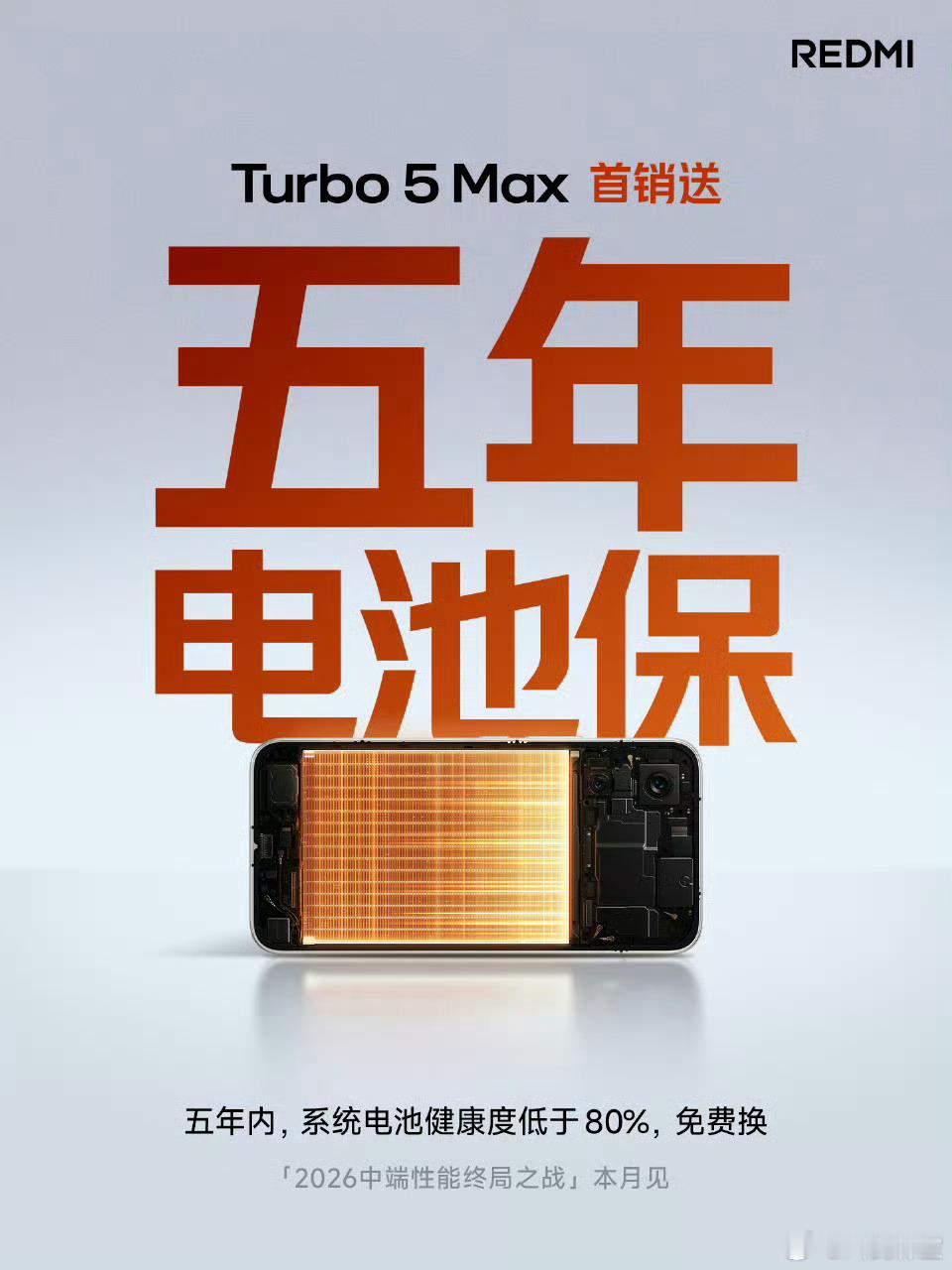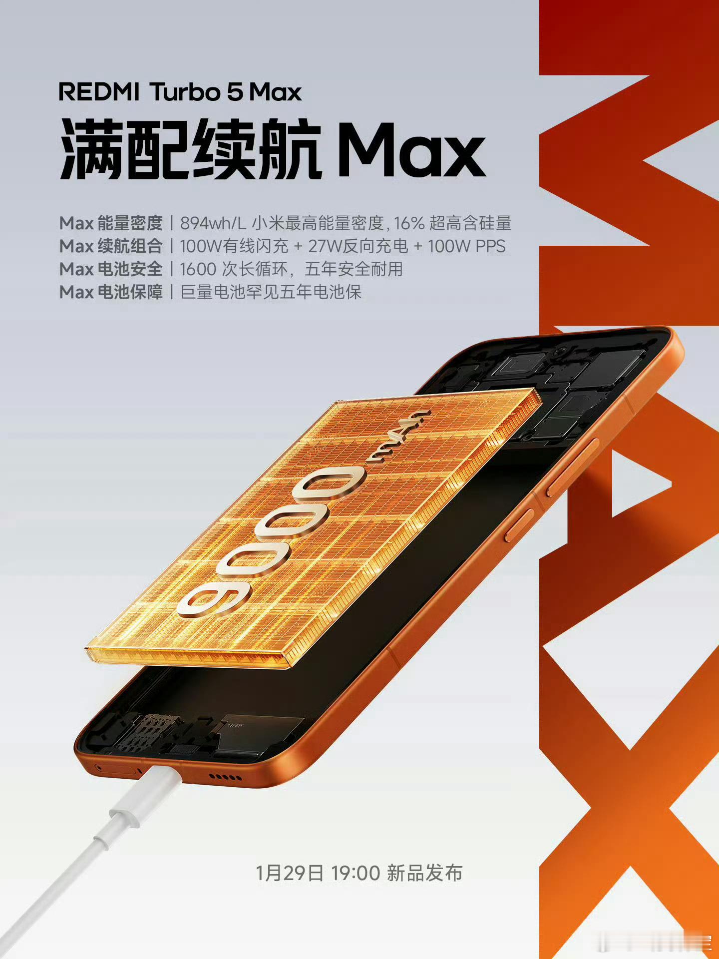 Turbo5Max定档1月29日 REDMI Turbo 5 Max重磅来袭,作为接档K系列的实力新旗舰,堪称全能机一点都不过分,内置9000mAh金沙江超大电池,让你彻底告别续航焦虑,搭配百瓦快充与27W反向充电,补能速度与续航耐力双在线!同时搭载了全球首发天玑9500s旗舰芯片,无论是日常多任务处理还是大型游戏重载,都能保持极致流畅。而且还给你配齐了IP68级防水、旗舰直屏、超声波指纹等,将在1月29日正式发布,让我们一起期待一下吧!