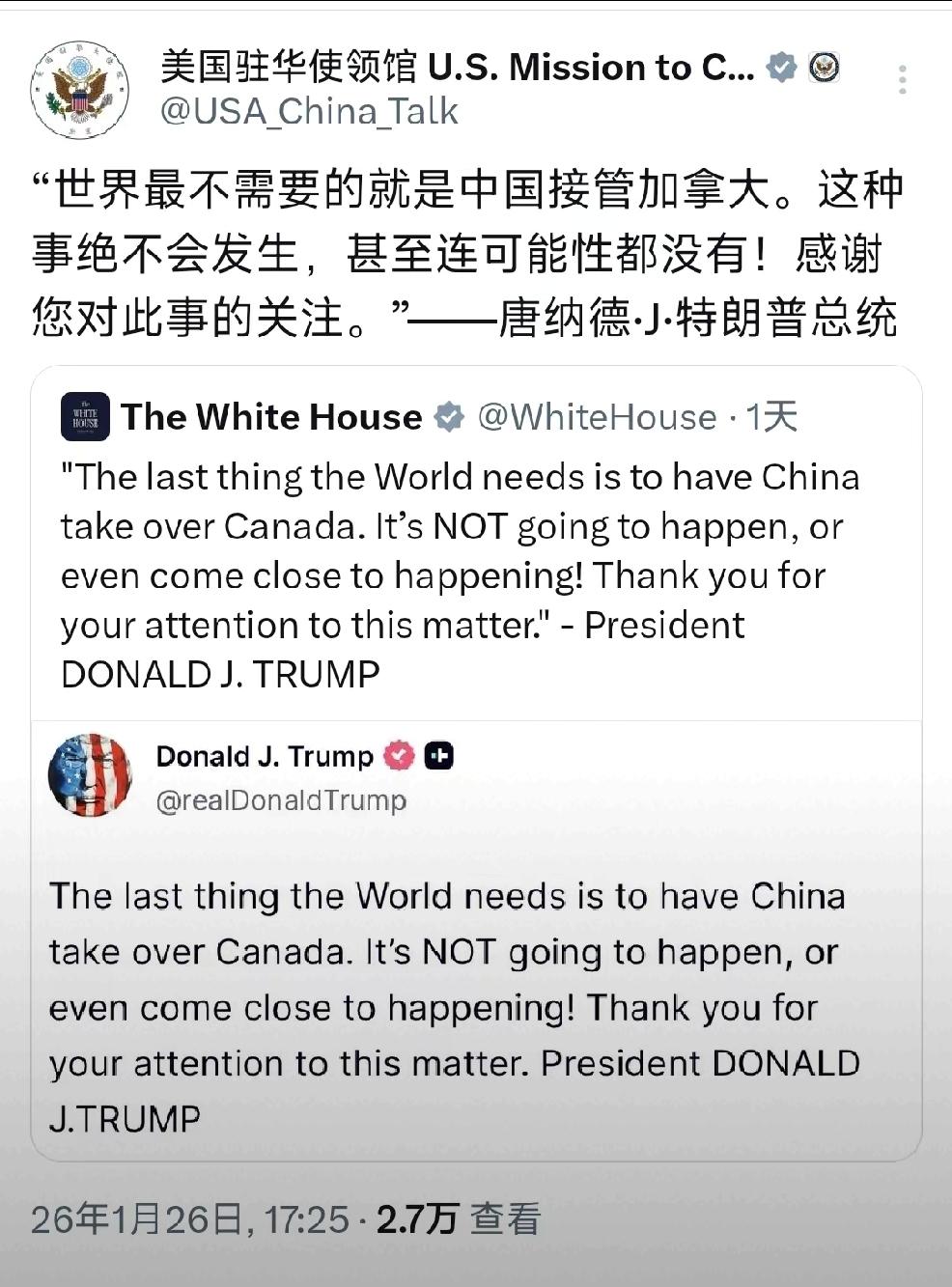 北京时间1月26日17:25,美国驻华使领馆发文:“世界最不需要的就是中国接管加拿大,这种事绝不会发生,甚至连可能性都没有。感谢您对此事的关注,唐纳德•小•特朗普” 个人认为:扭曲事实,诋毁造谣,抹黑泼脏水,看来美国不择手段的要拉扯上中国。 事实是:“我们中国与加拿大,两国之间正常的国际往来,怎么就会被美国诬陷成中国接管加拿大。” 美国人这么挖空心思的恶意扭曲事实,不如多花些心思在美国人民身上,不如多花些时间好好解决美国自身的隐藏的经济危机。 管好自己的手,管好自己的嘴,不要狗拿耗子,多管闲事儿了。