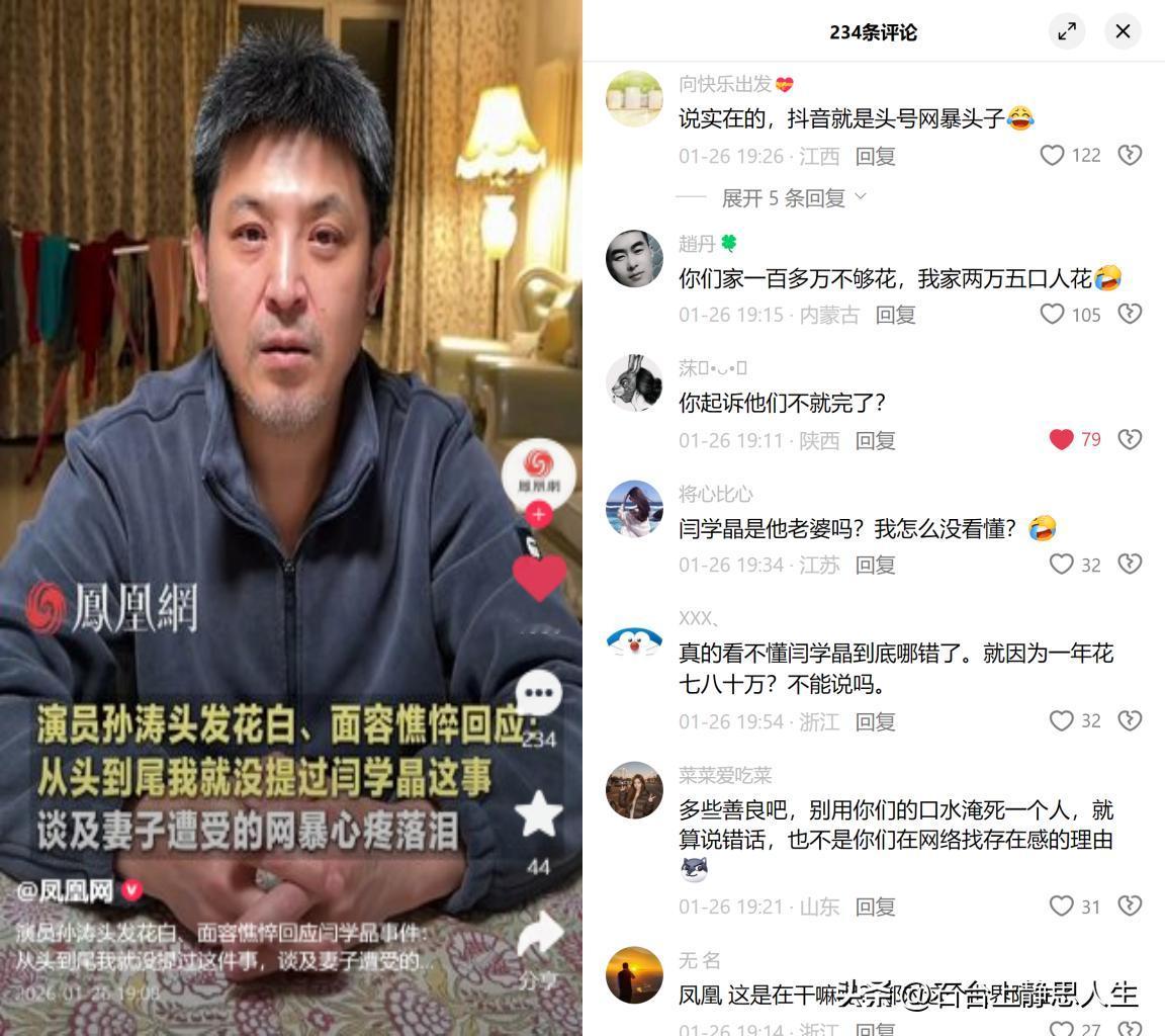 孙涛头发花白哭了:躺枪的滋味,太疼! 营销号剪了他和闫学晶的旧小品画面,编出力挺谣言,把他卷进舆论旋涡,连他老婆都遭无端网暴,逼得他发长视频澄清,说着说着红了眼。 这哪是个案?现在的流量贩子,最擅长无中生有造冲突,扒旧素材拼接,编离谱话术,管你冤不冤、相干不相干,只要能挑动情绪涨粉,哪管谁受伤害。 更扎心的是,造谣成本太低:一段剪过的视频、几句瞎话,就能把无辜者拖下水,让家人跟着遭殃。平台的监管缝隙,成了这些镰刀挥舞的自留地。 孙涛说永不直播带货,大概也是怕了这种躺着中枪的糟心。 流量的游戏里,认真生活的人,总最容易被当成垫脚石。你遇过这种无妄之灾吗?