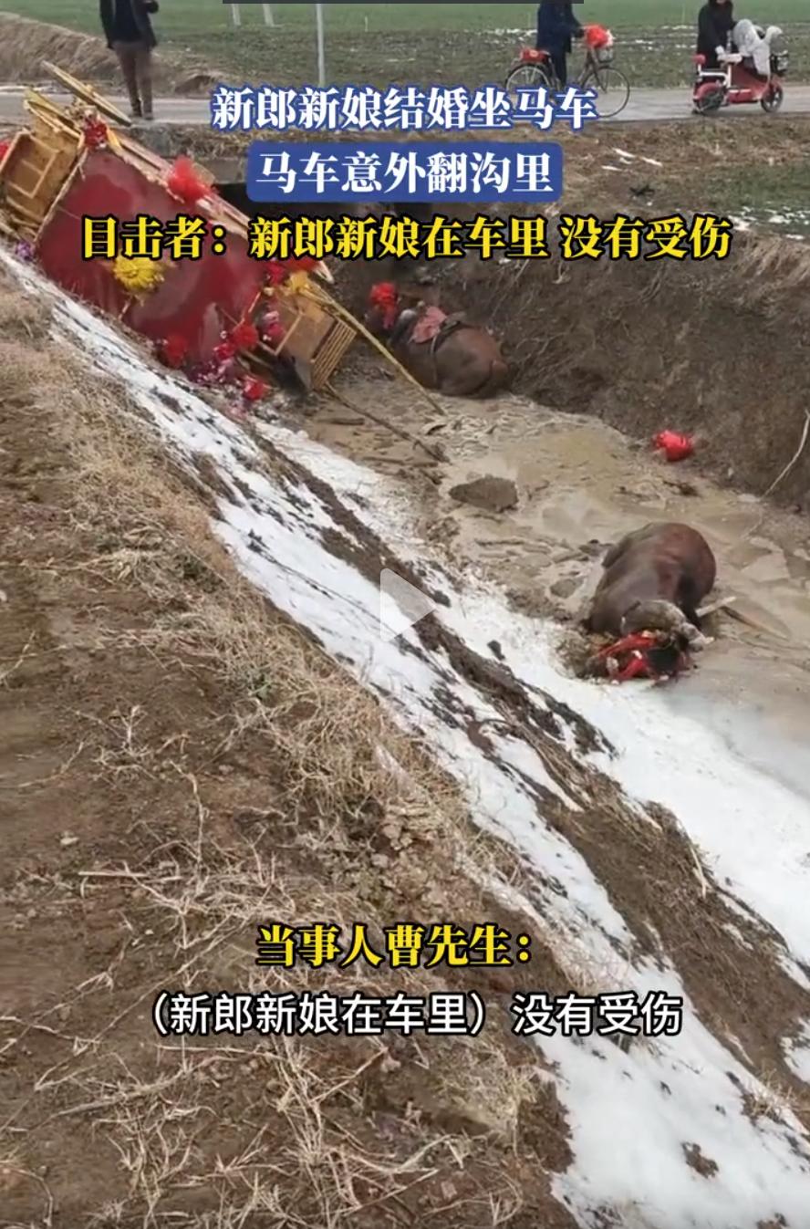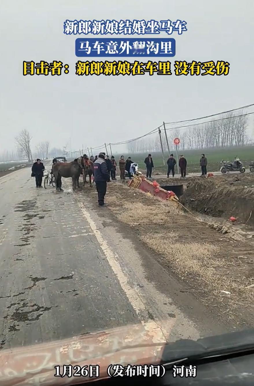 不厚道的笑了!河南周口,一对新人在腊八节当天结婚,为了婚礼更有纪念意义,特意选择坐马车接亲,万万没想到,路上马车意外翻进了沟里,而新郎新娘当时就坐在上面。网友:以后啥倒霉的事,这匹马都要背锅 原本,这对新人为了和传统轿车婚车不一样,他们找来了一辆装饰得花枝招展的马车,这下可真是与众不同了。谁料,马车一路跑得欢,结果马儿竟然一个劲儿往路边的沟里跑,没一会儿马车连人带马就掉进了沟里 据现场拍摄者表示,他也不理解为什么马会突然跑进沟里,当时马也没受惊,周围也没放鞭炮之类的响声,不知道马怎么就突然往沟里跑了,好在新郎新娘并没有受伤 有网友调侃说:这肯定没拍马屁,结果马不同意这妆婚事 当然,这只是玩笑话,婚礼出状况的事其实不稀奇,但这次因为用了马车,倒显得格外特别。现在很多人办婚礼都想搞点新花样,追求与众不同,这本身是好事。但有时候太注重形式,反而容易忽略实际的安全细节 像马车接亲,看着是浪漫,但马毕竟是活的动物,路上有什么动静,或者它自己突然有什么反应,人都没法完全预料。 这事让我想起,其实很多婚礼中的“创意环节”,都可能藏着一些没想到的风险。大家光顾着热闹、好看,却很少提前做足安全准备。这对新人还算幸运,只是虚惊一场,但万一真有点什么,喜事可能就要变味了
