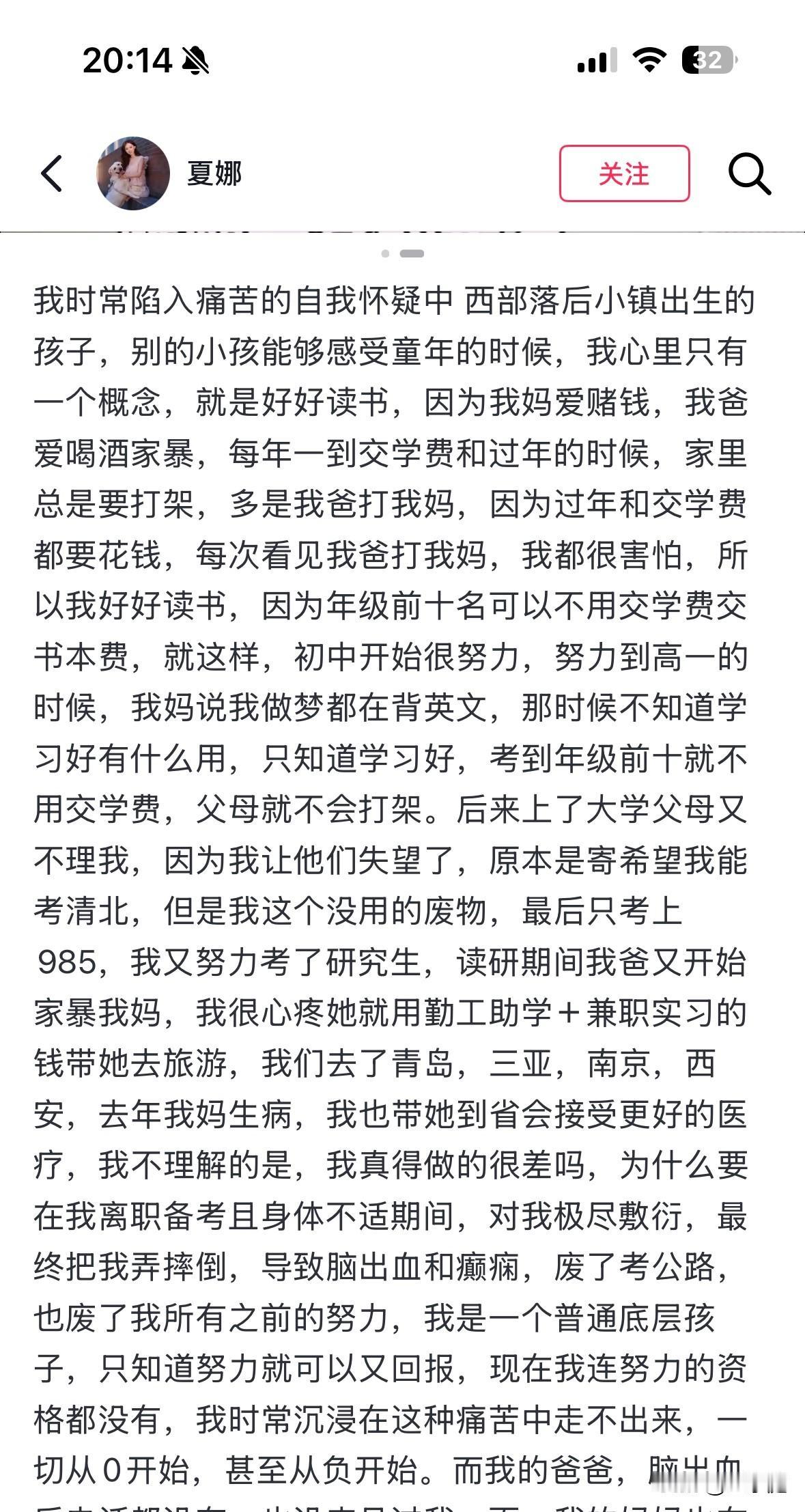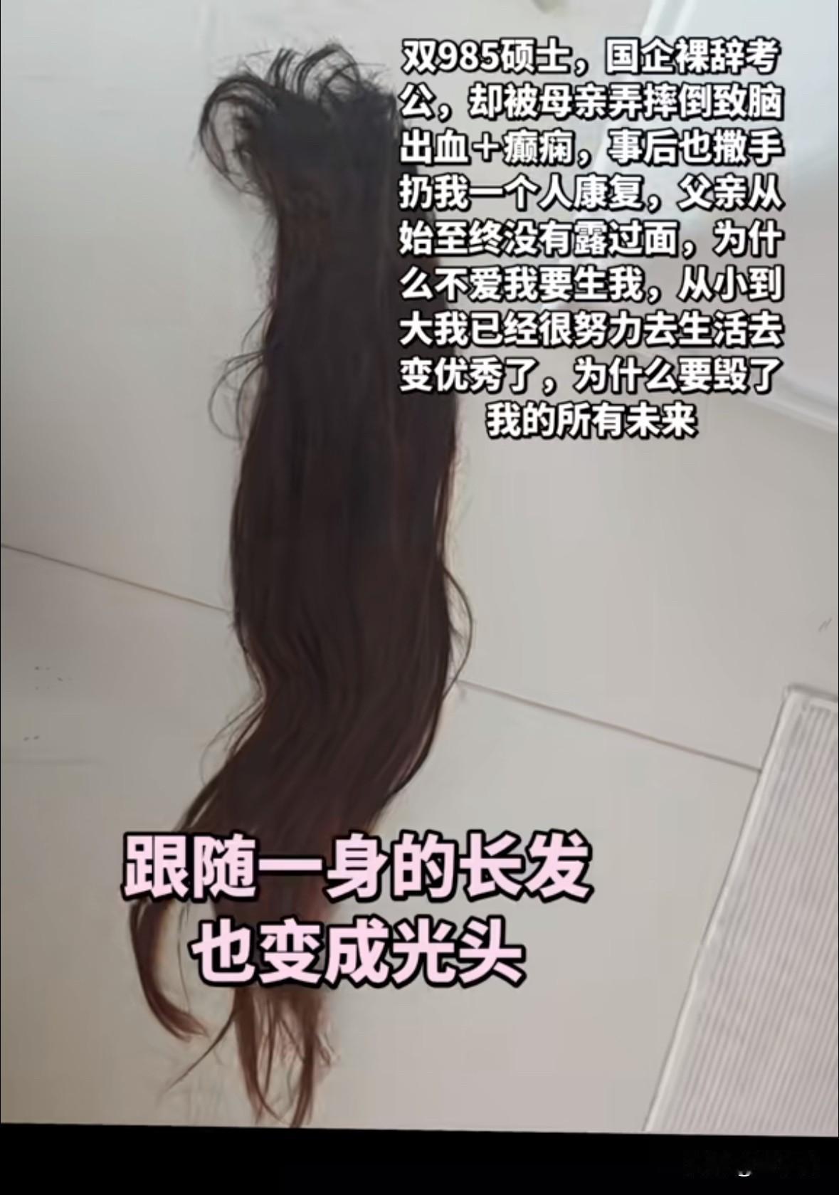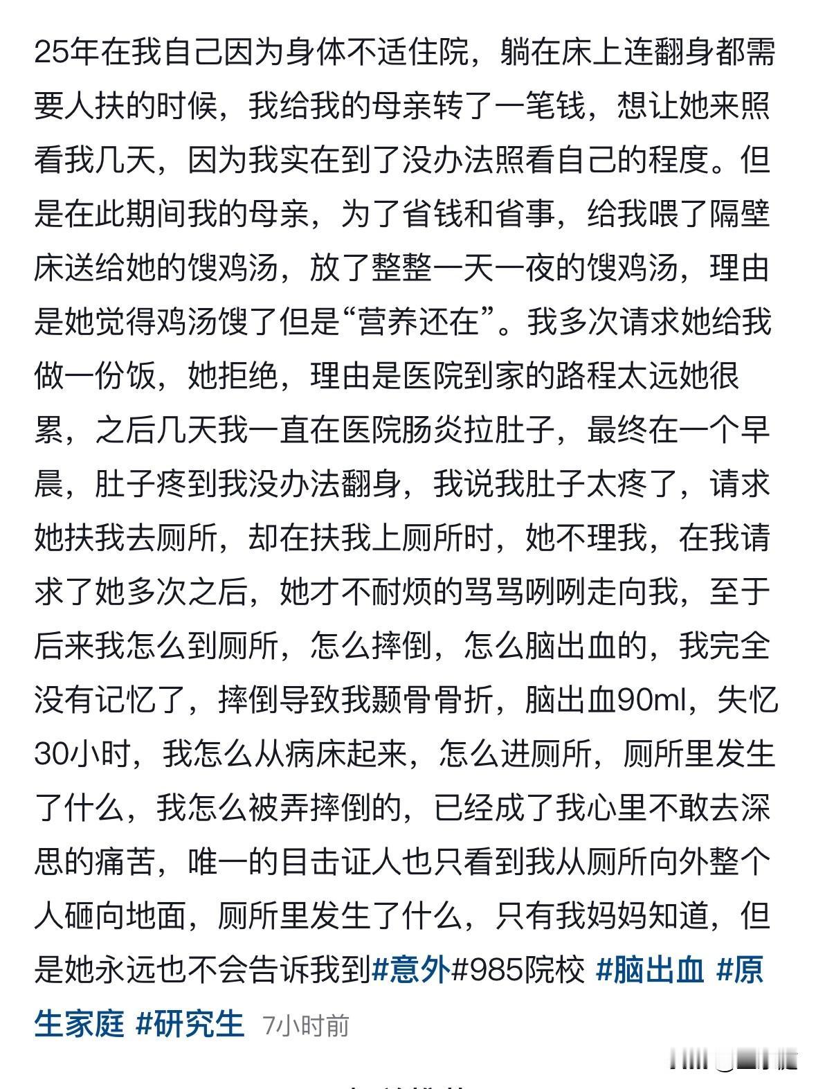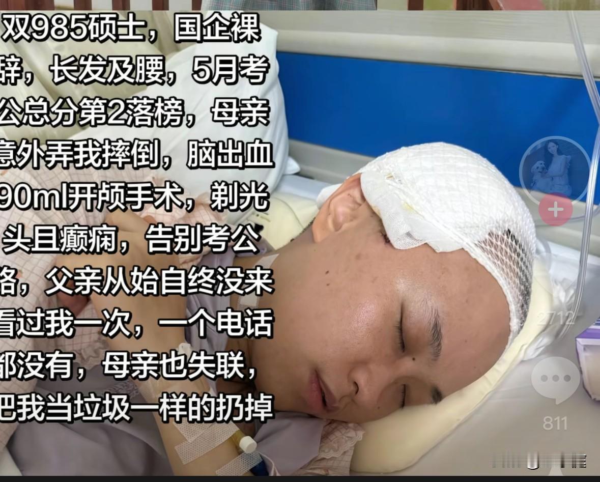 不是每一个父母都会爱自己的孩子,[流泪]这个双985女硕士的经历让人看的眼泪直流!她从国企裸辞出来考公,在这期间,因身体不适住进了医院。本想请母亲过来照顾她,没想到最终却因为对方的不耐烦,令她意外摔成了脑出血! 近日,这位女硕士,在自己的社交向上讲述了事情的大致经过。 她出生在一个经常吵吵闹闹的家庭里,母亲被打是家常便饭。在这样的氛围下,她小心翼翼的长大了。 她努力读书,毕业以后靠着自己的能力进入了一家国企工作。积攒了一些积蓄后,她辞职考公。 2025年,女生不幸落榜。没多久,她的身体又出现了问题。因为她孤身一人,还没有谈男朋友,迫不得已之下只能给在老家的母亲转了一笔钱,让她前来照顾自己。 可她的母亲才过来短短几天,就非常不耐烦了。不仅不愿意花心思给她做饭菜,还让她吃已经放馊的鸡汤。 她的母亲一点都不爱她,连扶她上厕所这点小事也不想做。可人有三急啊,这个可怜的女生便一直请求她母亲,最终对方是骂骂咧咧地才同意扶她去。 在去洗手间的这个过程里,女生因摔倒在地致脑出血90毫升。等她再次醒来时,已经过去三十多个小时,那时候她原本齐腰的长发早已经不在了。 但凡懂点医学知识的就会知道,脑出血90毫升究竟意味着什么! 事实上,这种情况属于极重度脑出血,情况相当危急,患者随时可能因脑疝、中枢性呼吸循环衰竭危及生命。换句话说,如若她是摔倒在别处,很有可能事情的结局就是另外一回事了。 这个可怜的女生,已经不记得自己究竟是怎么样去的洗手间,怎么样摔倒在地的了,因为那段记忆已经全都不在了。 事后,她的母亲对此事避而不谈,在她醒来后能完成基本的自理后,便第一时间离开了。 女生虽然有幸捡回一条命,但未来的人生估计会受到严重的影响。 现如今,她还在医院进行康复治疗,但她的母亲早已不见踪影,而她的父亲由始至终都没有来医院看过她一回! 在此,真的心疼这个女生的种种遭遇。明明她都已经那么努力了,明明她很快就要拥有明媚的人生了。可为什么给她造成伤害的,却是她最亲最爱的人呢? 都说天下无不是的父母,可看了这个女生的经历,我才知道原来真的有人是不会爱自己的孩子的。 写下这些文字之前,我沉默了好久,作为一个孩子的母亲,由始至终我都想不通,天底下为什么会有这样的父母呢? 信息来源:女生的个人社交账号(夏娜)