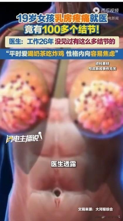 “年轻容不得消耗,觉醒吧!”河南肿瘤医院,一19岁女孩来就诊,称自己胸部疼痛并有肿块,医生检查发现女孩胸部竟有100多个结节,医生大为震惊:自己工作26年,没见过有这么多结节的!更何况女孩那么年轻!经医生了解女孩家并没此类疾病家族史,再继续询问,医生发现了发病根源:奶茶炸鸡外卖,真的别贪嘴了,还有愉悦地生活比什么都重要! “医生,我胸口疼得厉害,摸上去还有硬块,不会是得了什么重病吧?”河南省肿瘤医院超声介入门诊里,小琳攥着衣角,声音带着抑制不住的恐惧。 小琳刚满19岁,正是青春烂漫的年纪,可最近半个月,乳房的胀痛让她坐立难安,起初以为是生理期的正常反应,没想到疼痛越来越剧烈。 她年轻有抗劲,一般小来小去的病,吃点药就挺过去了,可这次胸部火辣辣的胀痛,她实在忍不住了才将此事告诉妈妈,随后妈妈带她来医院检查。 接诊的王医生从业26年,见过无数乳腺疾病患者,可小琳的检查结果还是让他大吃一惊。 超声屏幕上,密密麻麻的光点看得人头皮发麻,仔细计数后发现,小琳的双侧乳腺竟然长了100多个结节,大小不一,分布广泛。 她惊愕不已:从业这么多年,从没见过有这么多结节的病人,而且小琳还这么年轻! 王医生的话让小琳和陪同的妈妈瞬间慌了神,眼泪止不住地往下掉。 小琳的妈妈急得声音都变了调:医生,孩子怎么会这样? 王医生问他们家有没有这类病的家族史?妈妈摇着脑袋说:没有、没有,家人都没有这病! 医生排除家族遗传基因的可能,继续详细询问小琳的生活习惯,答案渐渐清晰起来。 小琳平时特别爱喝奶茶,几乎每天一杯,炸鸡、烧烤更是家常便饭,因为爸妈工作忙,她一日三餐大多靠外卖解决,很少吃家里做的家常菜。 除此之外,小琳性格内向,平时不爱说话,遇到烦心事也总是憋在心里,学习压力大的时候常常整夜焦虑得睡不着觉。 “没有遗传史,那问题大概率就出在生活习惯和情绪上。”王医生解释道,奶茶里的高糖、反式脂肪酸,炸鸡等油炸食品中的饱和脂肪,都会影响体内的激素水平,而乳腺结节的形成和激素紊乱密切相关。 长期吃外卖,饮食不规律,营养不均衡,再加上情绪压抑、焦虑,多重因素叠加,才导致了这么多结节的出现。 万幸的是,经过进一步检查,小琳的结节大多是良性的,暂时不需要手术,但必须立刻调整生活方式,定期复查。此病不容忽视! 现在很多年轻人都和小琳一样,把奶茶当水喝,把炸鸡、外卖当主食,觉得年轻就是资本,怎么吃都无所谓。 可身体从来不会说谎,那些你敷衍过去的健康问题,总有一天会以另一种方式提醒你。 小琳的内向和焦虑,其实是很多年轻人的通病。遇到委屈忍一忍,碰到压力扛一扛,总觉得“忍忍就过去了”! 可殊不知,坏情绪就像毒素一样,会在体内慢慢积累,最终影响内分泌,诱发各种疾病。 就像王医生说的:现在很多年轻女性的乳腺问题,都和情绪焦虑、压力过大脱不了干系。 更重要的是,要学会做情绪的主人,遇到不开心的事别憋着,该倾诉就倾诉,该“怼回去”就怼回去,别为没发生的事担惊受怕,也别揪着过去的烦心事不放。 路走不通的时候,学会拐弯;心情不悦的时候,学会看淡。 累一点没关系,但绝对不能不开心。因为不开心真的会生病,这不是危言耸听,而是被无数案例证明过的事实。 小琳的经历就是最好的警示,希望每个年轻人都能引以为戒,好好吃饭,好好睡觉,好好调节情绪,别等到身体亮红灯,才追悔莫及。 毕竟,健康永远是人生最宝贵的财富,没有之一。 年轻人觉醒吧,多吃点健康食品,快乐地活着!才是最重要的! 您对这么小女孩得乳腺结节这种病怎么看?对年轻人的生活习惯怎么看呢?