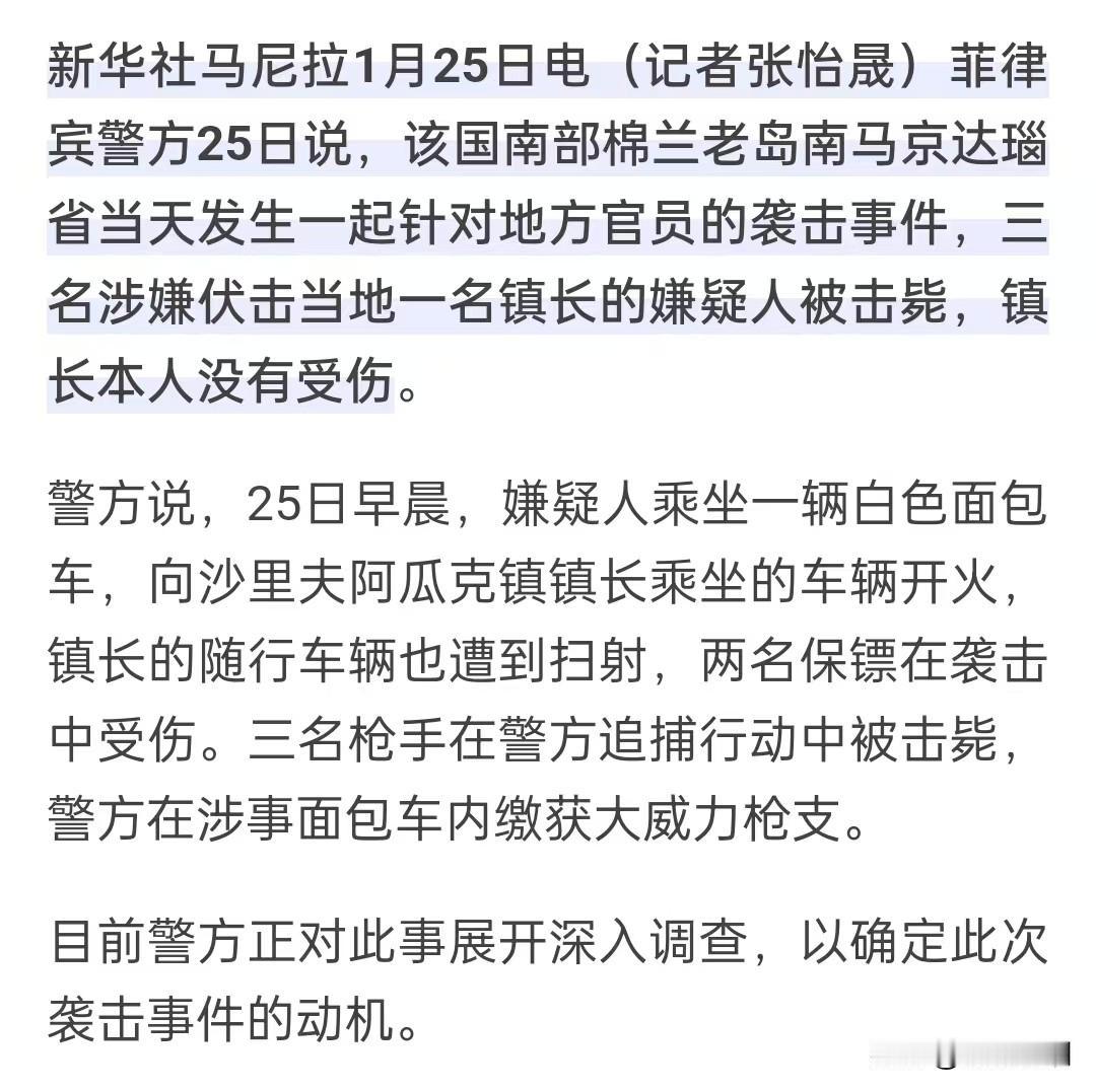▶️ 时讯!菲律宾一官员遭火箭筒袭击后续,三名袭击者被当场击毙…! 据新华社马尼拉1月25日电(记者张怡晟)菲律宾警方25日说,该国南部棉兰老岛南马京达瑙省当天发生一起针对地方官员的袭击事件,三名涉嫌伏击当地一名镇长的嫌疑人被击毙,镇长本人没有受伤。 警方说,25日早晨,嫌疑人乘坐一辆白色面包车,向沙里夫阿瓜克镇镇长乘坐的车辆开火,镇长的随行车辆也遭到扫射,两名保镖在袭击中受伤。三名枪手在警方追捕行动中被击毙,警方在涉事面包车内缴获大威力枪支。 目前警方正对此事展开深入调查,以确定此次袭击事件的动机。 【菲律宾,匪徒用火箭炮🚀当街刺杀官员】 点击链接打开👉 OBBAkXOKJlg` :8pm eRk:/ q@e.Ox 复制此条消息,打开「今日头条APP」或「今日头条极速版APP」后直接查看~