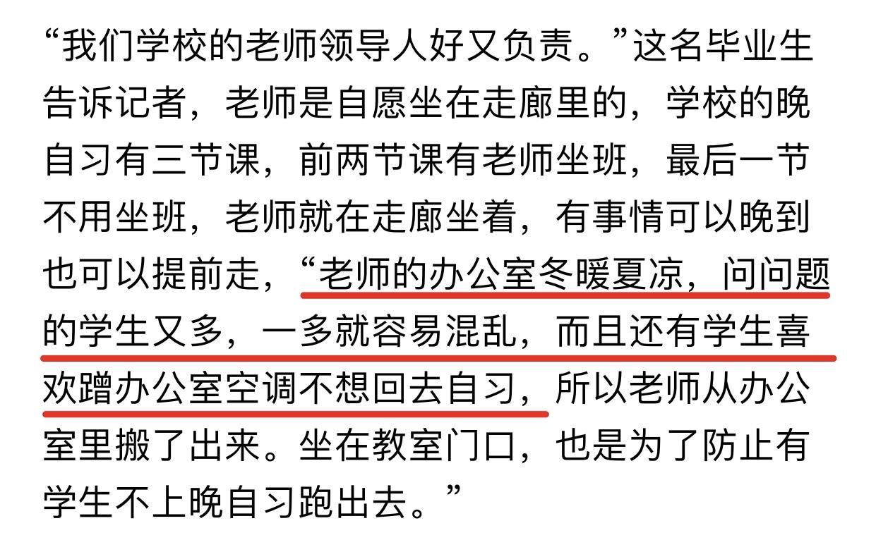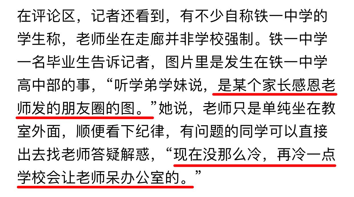 看看【寒夜露天走廊坐班照】被柳铁一中认领后各方的态度,才知道现在老师这个职业有多难:坐走廊是自愿的、天气是没那么冷的、家长是感恩的,学生是满意的……先抛开厚厚的羽绒服不谈,因为办公室太暖和学生太多就给老师安排到教室门外答疑,有道理但是少了些人情味儿,从领导到家长都满意,唯独坐在那捂地严严实实的教育者高不高兴,没人在意。