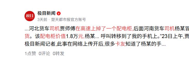 “脸都不要了!”一大货司机,在高速上掉了一个价值18000元的配电柜,之后发现是被一位卡友捡走,司机想要回配电柜,却被对方索要5000元“好处费”!事后司机吐槽:卡友何苦为难卡友? 在高速服务区的嘈杂声中,来自河北的贾师傅却感到一阵彻骨的寒意。这不是因为天冷,而是当他绕到货车后方检查时,发现那个崭新的配电柜凭空消失了。 那一刻,不仅是额头上的冷汗,连他口袋里的手机仿佛都变得滚客户催货的电话随时会打进来。摆在这个中年男人面前的,不仅仅是一个丢失的铁柜子,而是一道让他窒息的生存算术题。 这个配电柜价值18000元。对于坐在办公室里的人来说,这可能只是一个报销数字。但对于常年奔波在南宁线上的贾师傅而言,这是两到三趟长途跑下来的“卖命钱”。 为了赚回这1.8万,他得在高速上熬多少个通宵?得躲过多少个电子眼?得在车里吃多少顿泡面?货物丢失的瞬间,意味着他过去几个月的风餐露宿全部白干,甚至还要倒贴。 他不敢立刻告诉客户,像所有试图抓住最后一根稻草的人一样,他先是沿途折返,肉眼搜寻未果后,绝望地转向了“卡友圈”求助。在他朴素的认知里,路上的同行都是一家人,谁没个马高镫短的时候? 命运给了他一个看似温情的转折:监控锁定了,东西是被后方一位河南籍的大货司机捡到了。同是天涯沦落人,贾师傅松了一口气,他甚至想好了,拿回货后一定要给这位兄弟包个红包,算作油钱和辛苦费。 当电话接通的那一刻,温情剧本瞬间变成了残酷的商业博弈。电话那头的同行没有谈情义,直接把话撂在了桌面上:想要东西?拿5000块钱来。少一分免谈,报警也不怕。 5000元。这个数字像一记耳光,打碎了贾师傅对“行规”的所有幻想。这不是帮忙,这是赤裸裸的生意。对方显然精于计算,笃定贾师傅不敢承担1.8万的损失,于是精准地切下了一刀。 让我们把这个数字放在显微镜下看看。5000元占到了货物总价值的28%。这哪里是“感谢费”,这分明是按照绑架逻辑开出的“赎金”。 在文明社会的坐标系里,这个比例是惊人的。看看广州的规定,拾金不昧的奖励上限是10%,也就是1800元。在德国,这个法律底线甚至低至5%。 哪怕是把标准放宽到日本最高的20%,这位河南卡友的胃口也已经击穿了所有法律与道德的红线。他不是在维护自己的权益,而是在利用同行的灾难进行勒索。 《民法典》在这个问题上从不含糊:拾得人只有“必要费用请求权”,比如油费、保管费,绝没有“漫天要价权”。当那句“不怕报警”的狠话放出来时,性质已经变了。 这不再是民事纠纷,而是滑向了“侵占罪”的深渊。拒不归还代为保管的财物,数额较大,这在法律上是有明确量刑的。这位司机以为自己抓住了商机,其实是把自己送到了牢狱的门口。 更让人心寒的,不是钱,是那层被撕破的窗户纸。曾几何时,长途货运圈有着最质朴的江湖道义:路边修车搭把手,服务区里递根烟,这是高风险职业群体抱团取暖的本能。 可现在,这种默契正在被极少数人的贪婪瓦解。如果每一次善意的遗失,最终都变成了同类相食的“杀熟”现场,那以后在漆黑的高速路上,谁还敢期待后方伸出的援手? 网友们拿中学生拾金不昧的案例来对比,虽然听着刺耳,却一针见血。成年人的世界里,什么时候开始把“趁火打劫”包装成了“理所应当”? 贾师傅的遭遇,是整个行业生态恶化的一个缩影。当互助变成了博弈,当信任变成了筹码,高速公路就真的成了黑暗森林。 这5000元如果真的给出去,买回来的不仅是配电柜,更是整个货运圈良心的贬值。希望这位河南卡友能明白,有些钱烫手,拿了是会烫伤后半生的。
