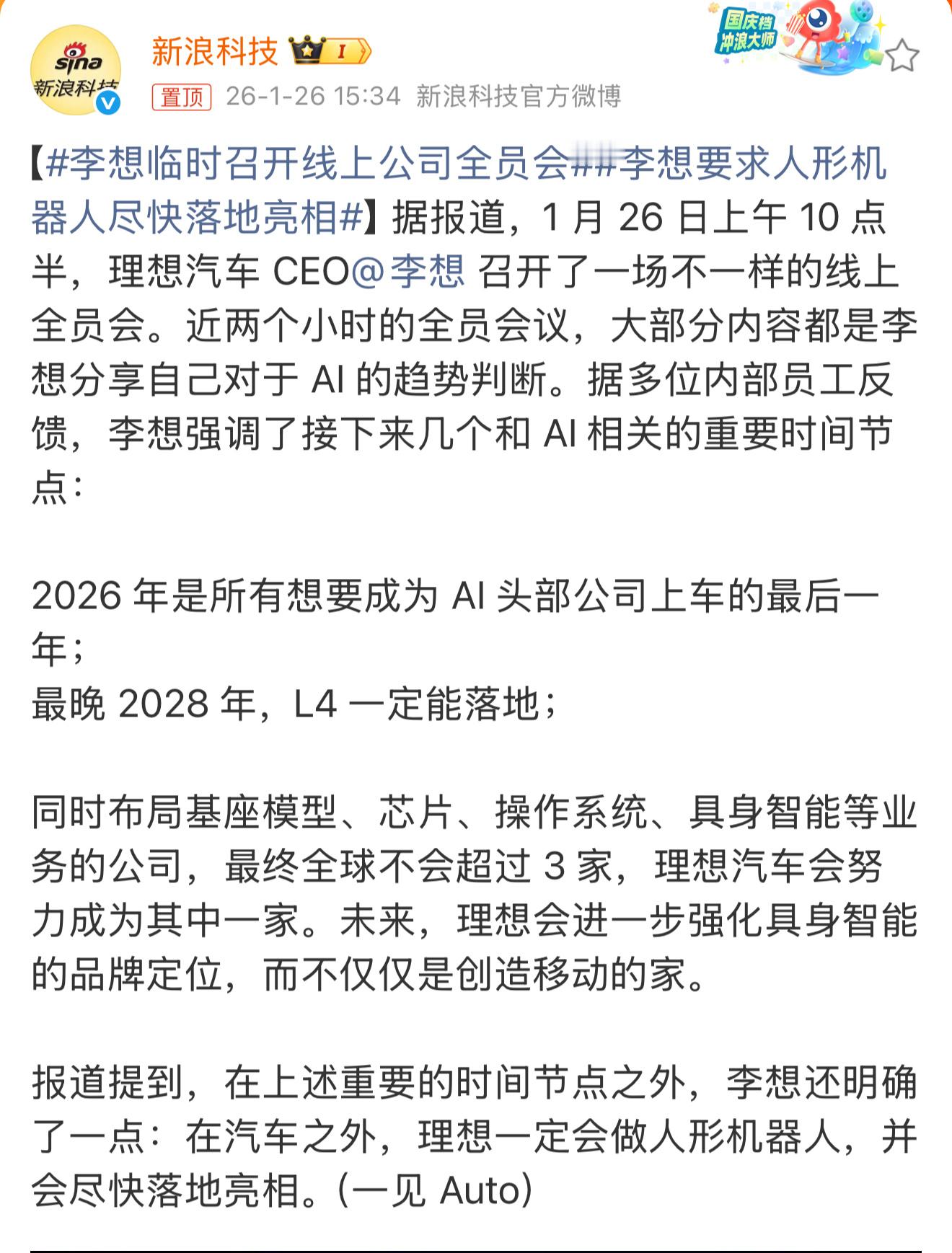 李想临时召开线上公司全员会 理想要布局基座模型、芯片等业务,还明确要做人形机器人并尽快亮相。这是要跳出车企标签,往科技公司转型,步子迈得不小。