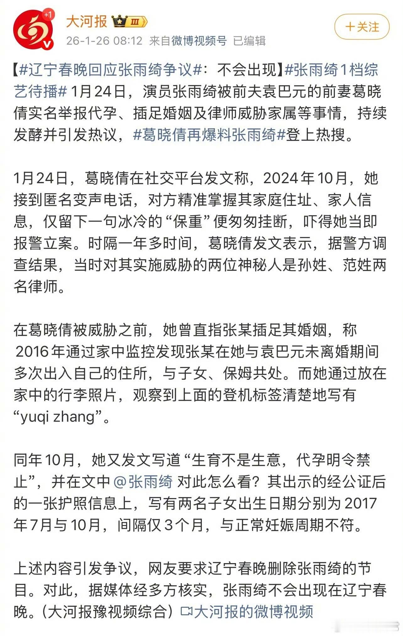 网友要求辽宁春晚删除张雨绮的节目代孕指控:前夫袁巴元前妻葛晓倩在直播中否认张雨绮