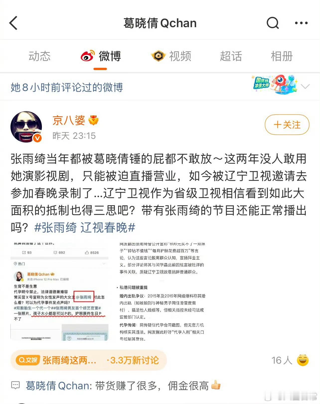 网友要求辽宁春晚删除张雨绮的节目作为明星,私德不行、价值观不正,就应该封杀,免得