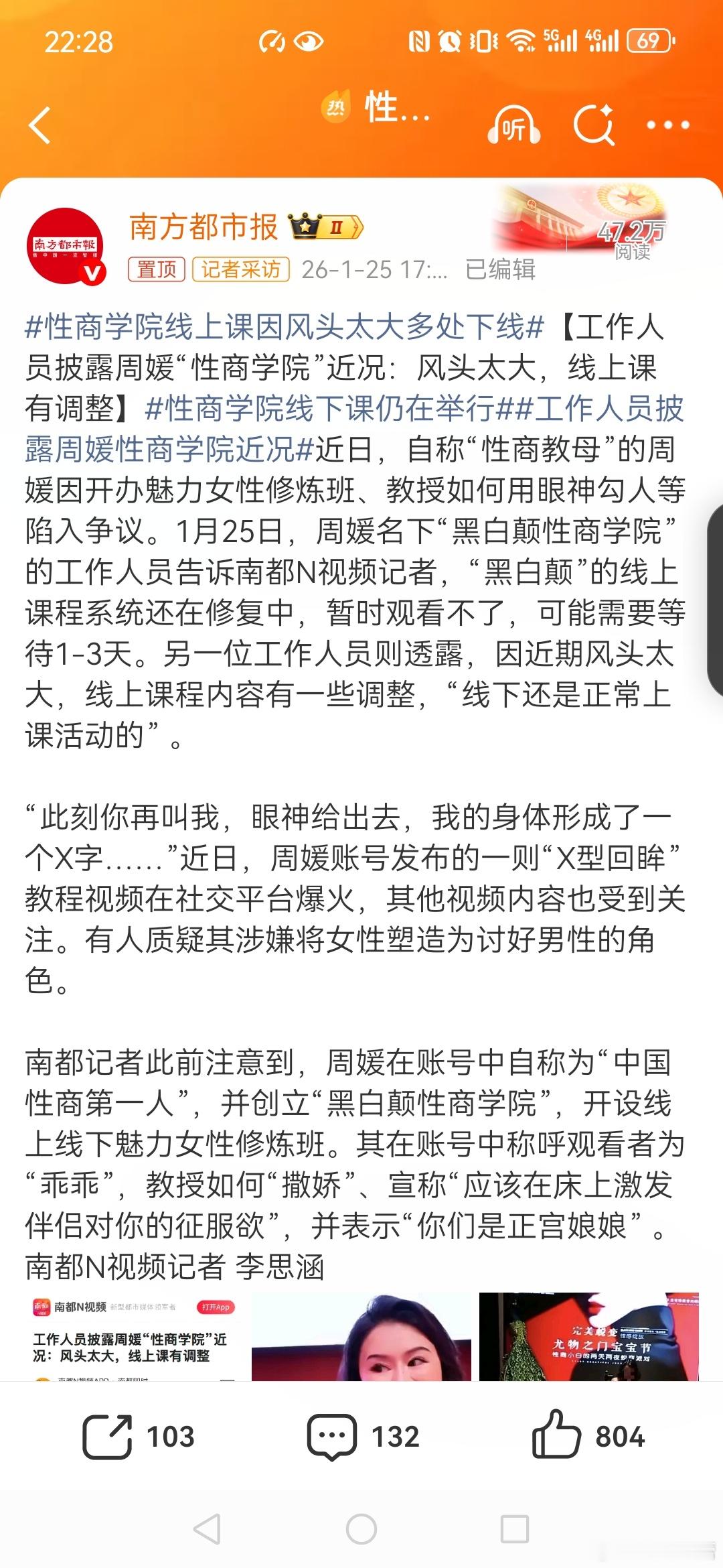 性商学院线上课因风头太大多处下线性商学院线下课仍在举行工作人员披露周媛性商学院近况将女性魅力简单地理解为“身体”“眼神”的“魅惑”,这不是真正的女性魅力,而是一种歪门邪道。 她们不顾道德伦理,教育女性利用肉体去“捞钱”,这些人就是在教正常女性变成捞女和荡妇,就是罪大恶极。大清早亡了,我们国家的妇女也能顶上半边天了,怎么现在这些牛鬼蛇神还有这么多信众? 记住:真正的优秀女性,是独立自信,是英姿飒爽,是不以外物而转移自己的内心。女性的魅力,从来不需要所谓的“性商教母”来定义,也绝对不应该窄化为某种形式上的表演。在这个天地间, 坦坦荡荡,活出自我的人,才能真正称得上具有魅力。 凡以色事人者,色衰而爱驰。有点阅历和实力的男人往往看中的都不是这些搔首弄姿的伎俩(这些对他们来说太容易得到了)。所以即使有人花钱学会了这些所谓的“技巧”,也是很难如愿以偿的。 这个女人其实是在割韭菜,同时物化我们女性同胞,封的好!