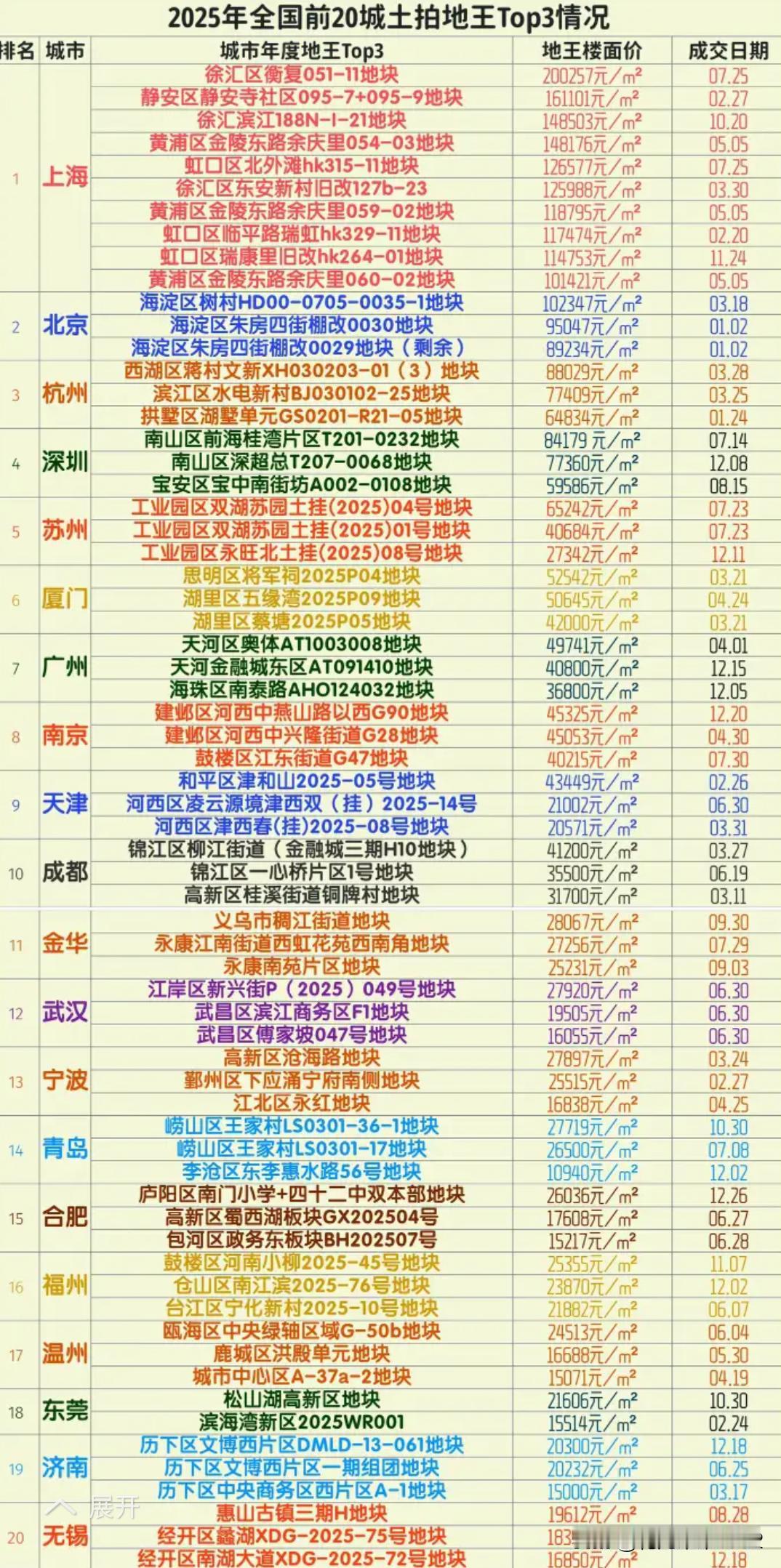 2025年前20个城市最高楼面价,上海楼面价1㎡都要投20万一㎡,最低的无锡市也要投1.6万1㎡。四川成都三个楼王,最低的都要投3.1万1㎡