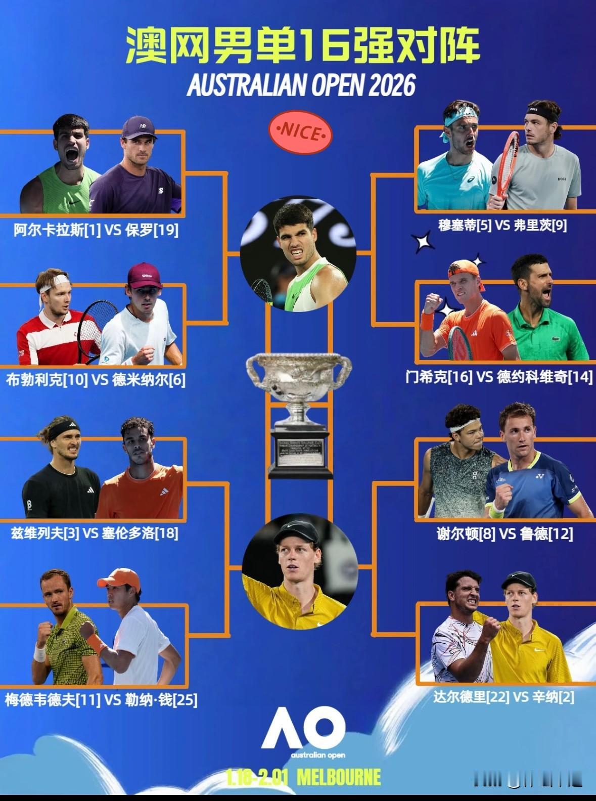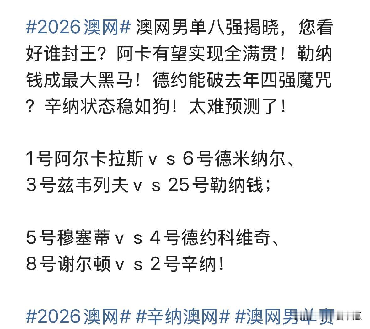 男单八强揭晓,这对阵太有看头了,这冠军归属真让人捉摸不透。 阿卡要是拿下冠军,就能实现全满贯,这诱惑谁能挡得住?他和德米纳尔的对决,阿卡实力占优,实现梦想的机会很大。 勒纳钱堪称最大黑马,一路杀进八强,碰上兹韦列夫,说不定能再爆冷门。 德约这次能破去年四强魔咒吗?他和穆塞蒂的比赛,德约经验丰富,胜算不小。 辛纳状态一直很稳,和谢尔顿的较量,大概率能赢。 这几个人都有封王的可能,只能说这场澳网男单冠军之争,绝对精彩!