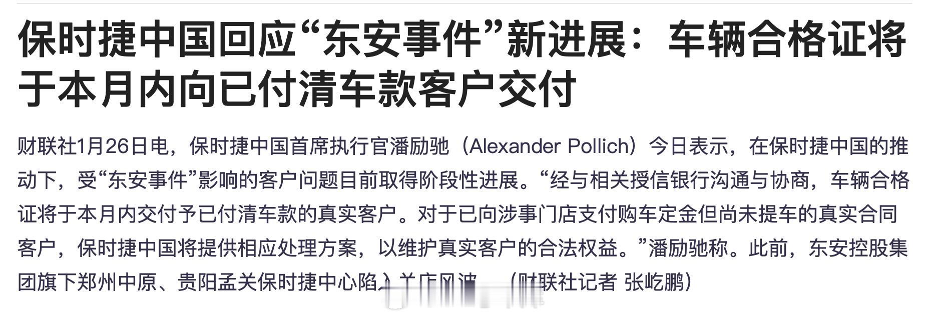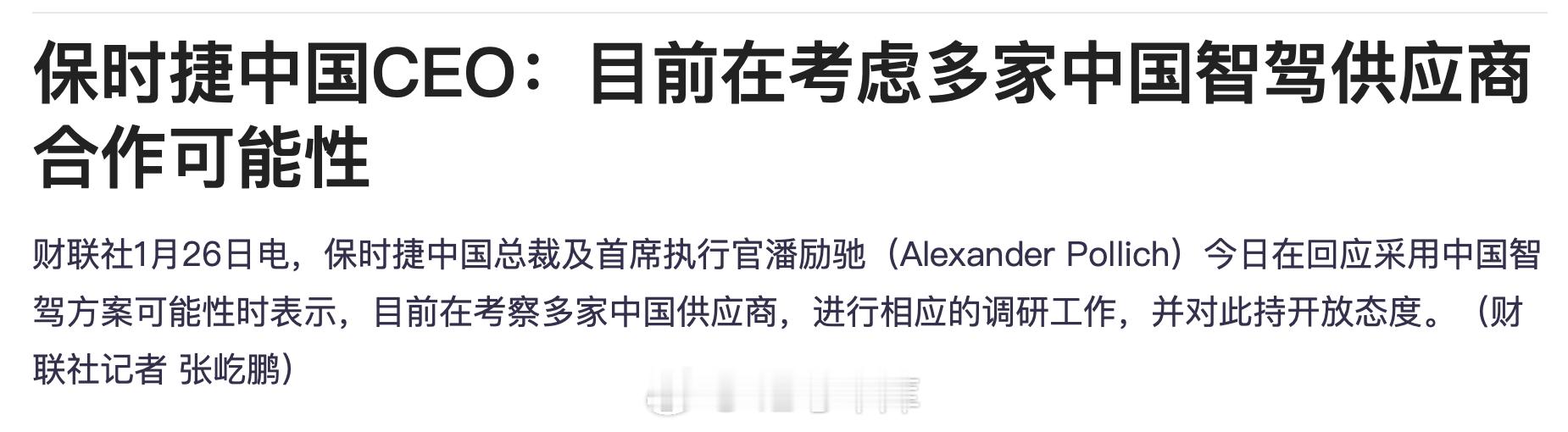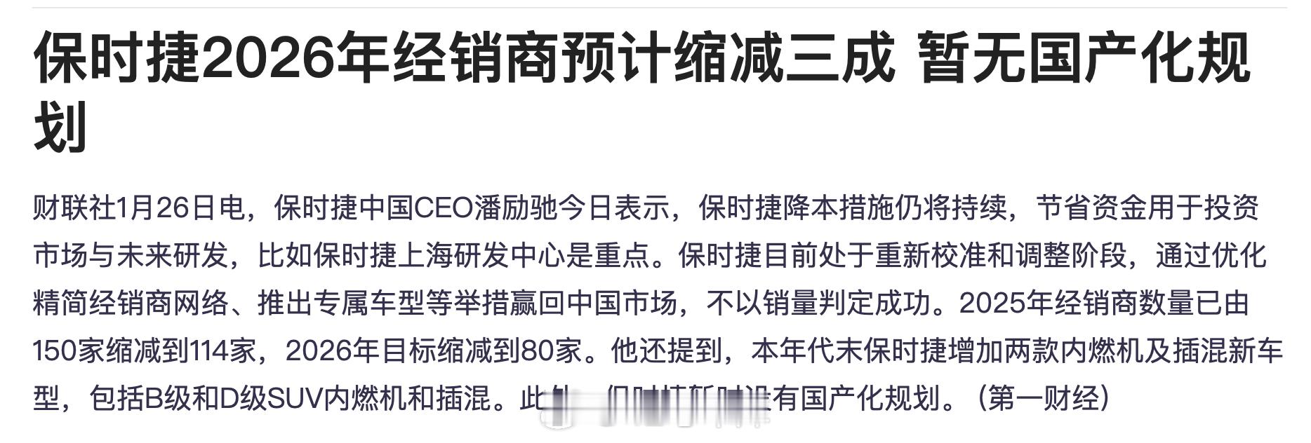 今天保时捷 CEO 潘励驰跟《财联社》等媒体透露的一些关于保时捷的新消息:- 智驾方面,目前在考察多家中国供应商,进行相应的调研工作,并对跟中国供应商的合作持开放态度。- 2025 年经销商数量已由 150 家缩减到 114 家,2026 年目标缩减到 80 家。本年代末保时捷增加两款内燃机及插混新车型,包括 B 级和 D 级 SUV 内燃机和插混。此外,保时捷暂时没有国产化规划。- 之前东安控股集团旗下郑州中原、贵阳孟关保时捷中心陷入关店风波。潘励驰今天回应:「经与相关授信银行沟通与协商,车辆合格证将于本月内交付予已付清车款的真实客户。对于已向涉事门店支付购车定金但尚未提车的真实合同客户,保时捷中国将提供相应处理方案,以维护真实客户的合法权益。」大家觉得保时捷今年的销量能回暖不?42how新能源汽车保时捷