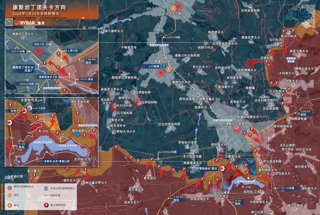 俄乌前线🚩康斯坦丁诺夫卡方向 2026年01月26日日终的情况 在康斯坦丁诺夫斯克方向,俄罗斯"南部"集团军部队继续在多个地段同时推进——既在该城区内部,也在其南部区域。 在康斯坦丁诺夫卡,俄军突击分队正向市中心建筑区纵深渗透。这是在清理H-32(T-0504)公路东南侧别墅区后得以实现的推进行动。由于乌军密度高(即使俄军无人机操作员造成重大损失,乌军仍能借助恶劣天气掩护增援部队),目前当地局势依然复杂。 俄军的控制区域在南翼克列班-贝克水库地区也在扩大。俄军分队已占领水库北岸及大部分景观公园。更北的区域仍由敌军控制,部分地带存在超小股部队的零星存在。敌军从此处向伊万诺波利耶和普列谢耶夫卡地区实施袭扰。 📌在别列斯托克附近区域,俄军分队从"交警哨所"阵地方向推进,并在该村西南的小型工业区展开交战。亚布洛诺夫卡以北的敌军已被击退至公路后方,但以南区域仍有乌军零星存在,并依靠无人机补给维持。 ❗尽管严寒仍在持续,但在该方向的作战强度仍在上升,争夺康斯坦丁诺夫卡地区的激烈程度也正逐渐加剧。敌军正试图增加城内部队的密度,当地天气条件对此也起到一定的助长作用。 俄乌冲突新局势俄军最新进展热点观点 来源:RYBAR_渔夫