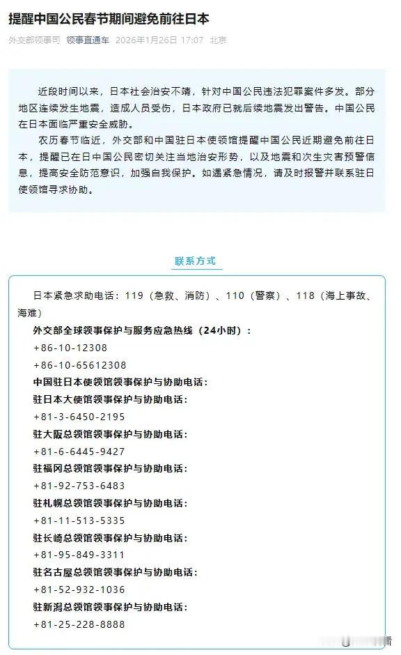 ⚠️春节赴日预警!外交部紧急提醒:避免前往! 所有计划春节去日本的朋友们注意啦! 官方最新通知👉 2026.1.26 领事直通车权威发布 春节期间尽量别去日本!已在当地的务必做好防护! 🔴 为啥不建议去?双重风险预警! 1. 针对中国公民的违法犯罪事件多发,人身财产安全没保障 ​ 2. 日本多地连续地震+余震预警没解除,次生灾害风险高 双重安全威胁,真的别拿平安赌! 🆘 已在日人员必看(救命干货) ✅ 减少不必要外出!避开人多的地方和高风险区域 ✅ 紧盯地震、海啸预警,备好应急物资 ✅ 牢记紧急电话: 110(报警)| 119(急救/消防)| 118(海难) ✅ 领事求助(24小时在线): 全球热线:+86-10-12308 / +86-10-65612308 驻日使馆:+81-3-6450-2195 大阪总领馆:+81-6-6445-9427 福冈总领馆:+81-92-753-6483 ✈️ 计划赴日的宝子这样做 ❶ 直接暂缓行程!优先选安全稳定的目的地 ❷ 已买票的赶紧联系航司退改,多家航司有免退改政策 ❸ 真有紧急情况必须去: 行前在“中国领事”APP登记 全程结伴同行,不夜间独行、不去偏僻地方 随身带好应急物资和联络清单 我觉得春节出行,安全永远是第一位的! 转发给身边计划赴日的朋友,互相提醒别踩坑~🙏