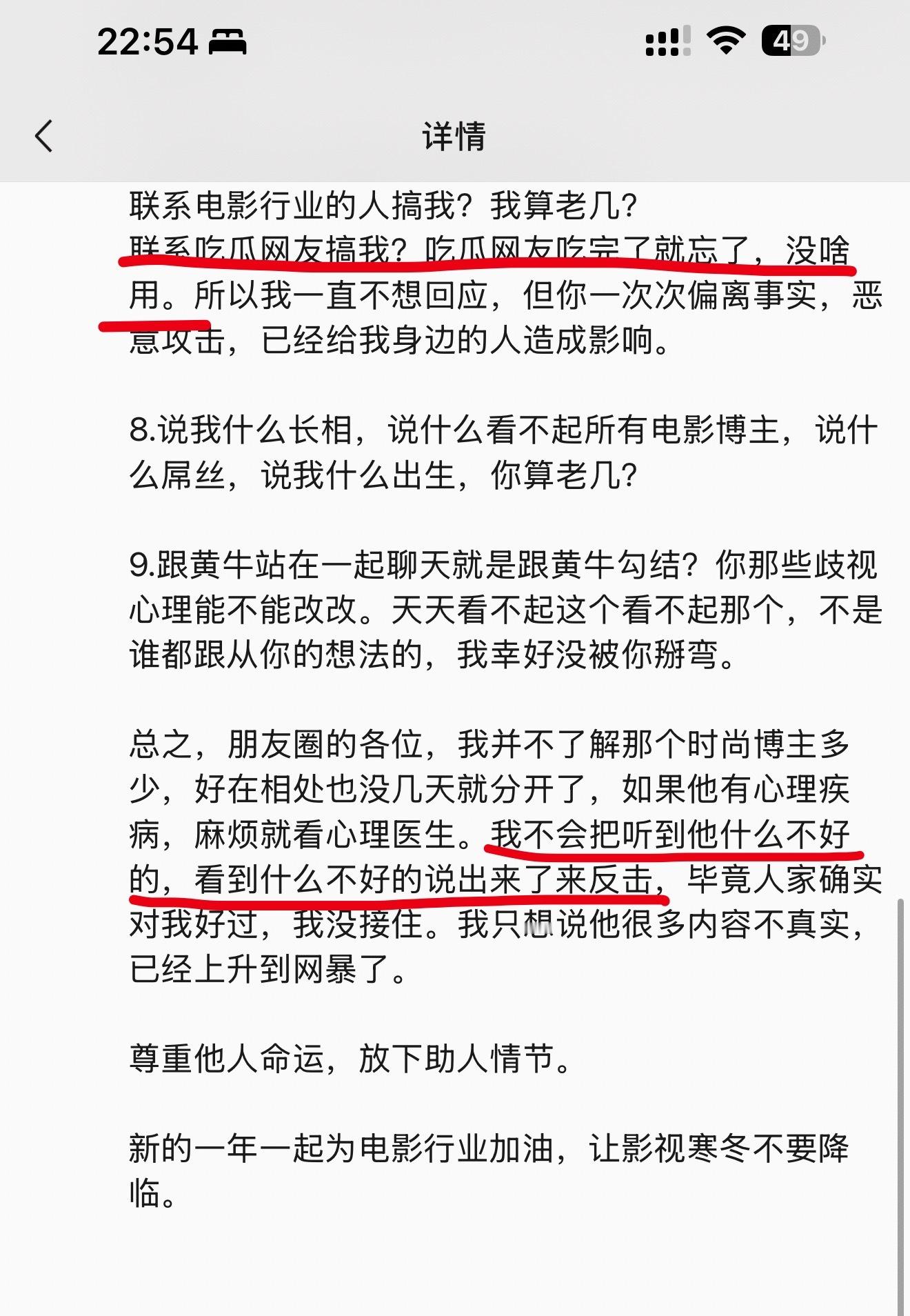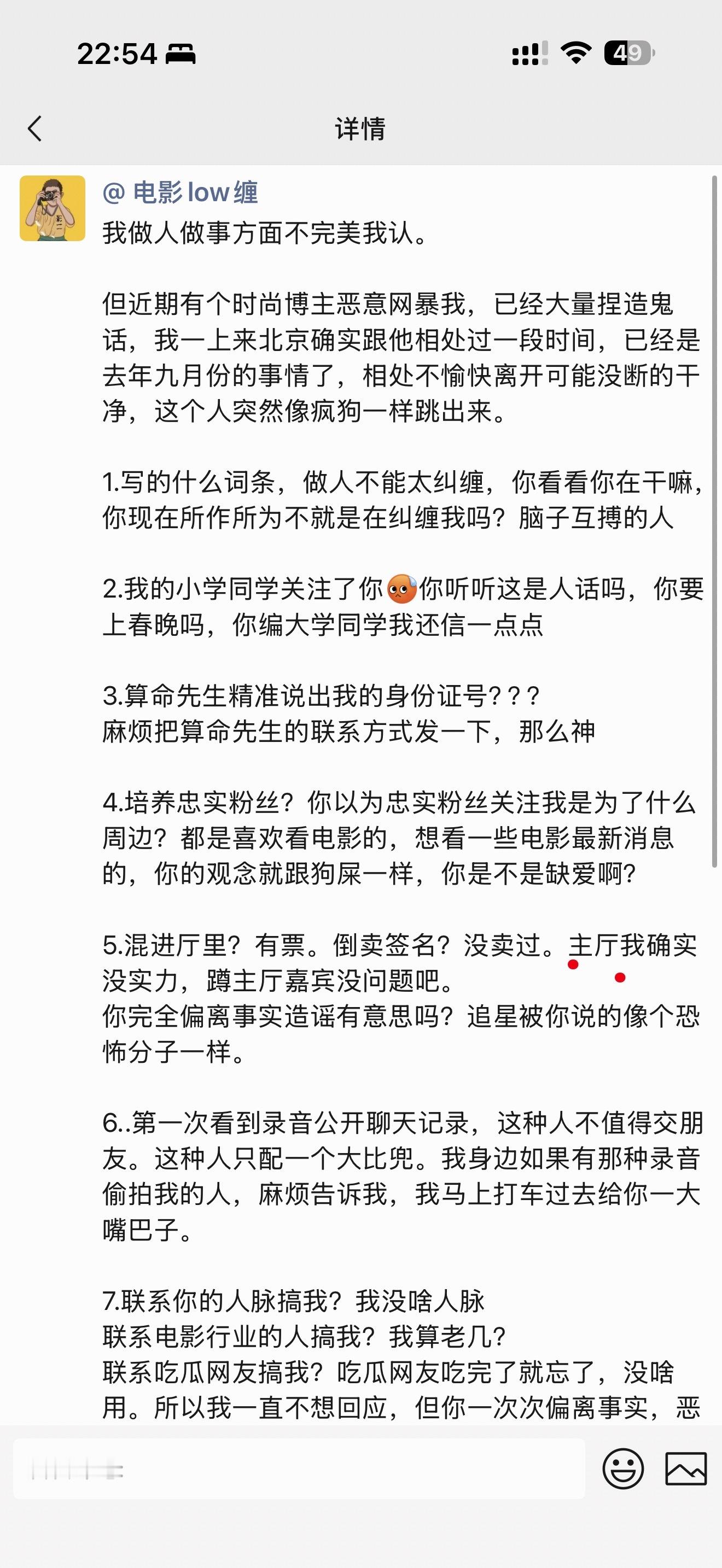如果有黑我的锤。麻烦请第一时间发出来。 我从小到大做的任何事都可以放在台面上示众。我最不怕的就是光脚不穿鞋。 如果你不发我会理解为,你压根就没有任何能反击我的任何点。因为你心里清楚,从我扶贫你开始 我对你问心无愧。 即使把你扫地出门了。 我也没有选择曝光你任何, 是因为你不要脸破坏生态产业链。骚扰女生。 掠夺资源。 天天装逼。 是因为你蠢事做尽。说我坏话。 得罪同行。 如果我不下场, 你真的狂妄到没边了。说我什么坏话呢? 说我完美主义。 那肯定的啊。 我是一个对细节大小事都非常敏感的人。 说我看不起人。 我看不起谁了? 看不起你啊。 你自己干的一桩桩一件件我怎么看的起。 我教你赚钱拉扯你胃资源。 我的确用了不要温柔的方式对待你。 但是我也真心实意让你受益了。 我还能用什么好脸色 ,我难不成还要一口一口给你喂饭吗? 你自己蠢逼蠢事做尽。我节奏很快要求很高。 稍微机灵点的早上路了,还能让我下场一遍遍催着发微博还人情啊。 我给你机会了 我给你太多机会了 你干啥了即使被扫地出门了。逢年过节没钱送礼我理解,一句微信也不知道做做样子。 见到我躲得远远的。 你说你感恩,你是怎么做的。
