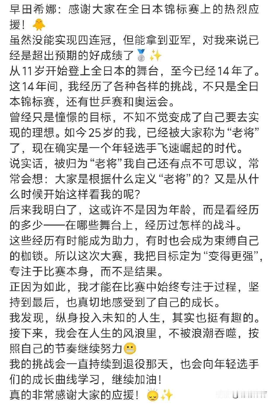 早田希娜感谢大家在全日本锦标赛上的热烈应援,虽未实现四连冠,但收获亚军已是超出预期的好成绩。 她从11岁登上全日本赛场,至今已走过14年乒乓路,期间历经世乒赛、奥运会等诸多赛事,曾经憧憬的目标已成为自己要践行的理想。 25岁的她被大家称为“老将”,起初对此感到不可思议,后来领悟到“老将”的定义无关年龄,而是源于赛场经历的多少与战斗的沉淀。 过往经历既可能成为助力,也可能成为束缚,此次大赛她将目标定为“变得更强”,专注比赛过程而非结果,最终真切感受到了自身的成长。 她发现投身未知的人生颇具趣味,未来会在人生风浪中坚守自己的节奏,乒乓之路的挑战将持续至退役,同时也会向年轻选手的成长学习,继续前行。