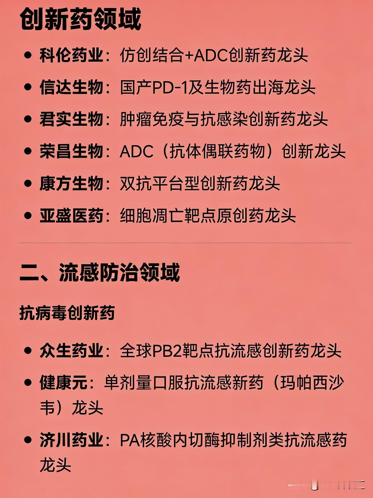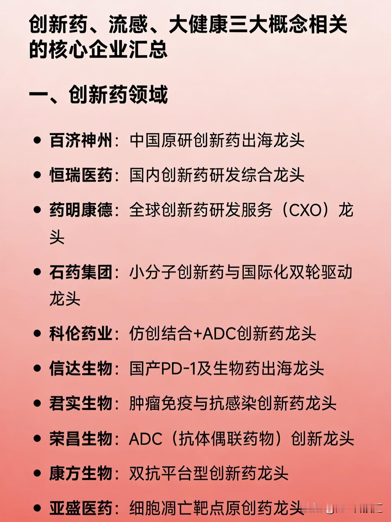 创新药、流感、大健康三大概念相关的核心企业汇总 一、创新药领域 百济神州:中国原研创新药出海龙头 恒瑞医药:国内创新药研发综合龙头 药明康德:全球创新药研发服务(CXO)龙头 石药集团:小分子创新药与国际化双轮驱动龙头 科伦药业:仿创结合+ADC创新药龙头 信达生物:国产PD-1及生物药出海龙头 君实生物:肿瘤免疫与抗感染创新药龙头 荣昌生物:ADC(抗体偶联药物)创新龙头 康方生物:双抗平台型创新药龙头 亚盛医药:细胞凋亡靶点原创药龙头 二、流感防治领域 抗病毒创新药 众生药业:全球PB2靶点抗流感创新药龙头 健康元:单剂量口服抗流感新药(玛帕西沙韦)龙头 济川药业:PA核酸内切酶抑制剂类抗流感药龙头 奥司他韦 & 传统抗流感药 东阳光药:奥司他韦制剂市场占有率龙头 科伦药业:奥司他韦原料药+仿制药成本优势龙头 中成药抗流感 以岭药业:连花清瘟系列抗流感中成药龙头 流感疫苗 华兰生物:四价流感疫苗产能与市占率龙头 百克生物:鼻喷流感减毒活疫苗独家龙头 金迪克:四价流感疫苗第二极龙头 康泰生物:多价流感疫苗研发推进龙头 对症治疗 & 呼吸用药 华润三九:OTC感冒药(999系列)龙头 特一药业:止咳化痰类流感辅助用药龙头 丽珠集团:呼吸系统用药管线布局龙头 三、大健康服务与平台 京东健康:互联网医疗与健康服务平台龙头 平安好医生:在线问诊与健康管理平台龙头 九州通:医药流通与基层健康服务网络龙头 国新健康:医保控费与数字健康服务龙头 美年大健康:体检与预防医学服务龙头 泰康健投:医养结合与健康养老生态龙头 讯飞医疗:AI+医疗健康解决方案龙头 华大智造:精准健康与基因检测设备龙头