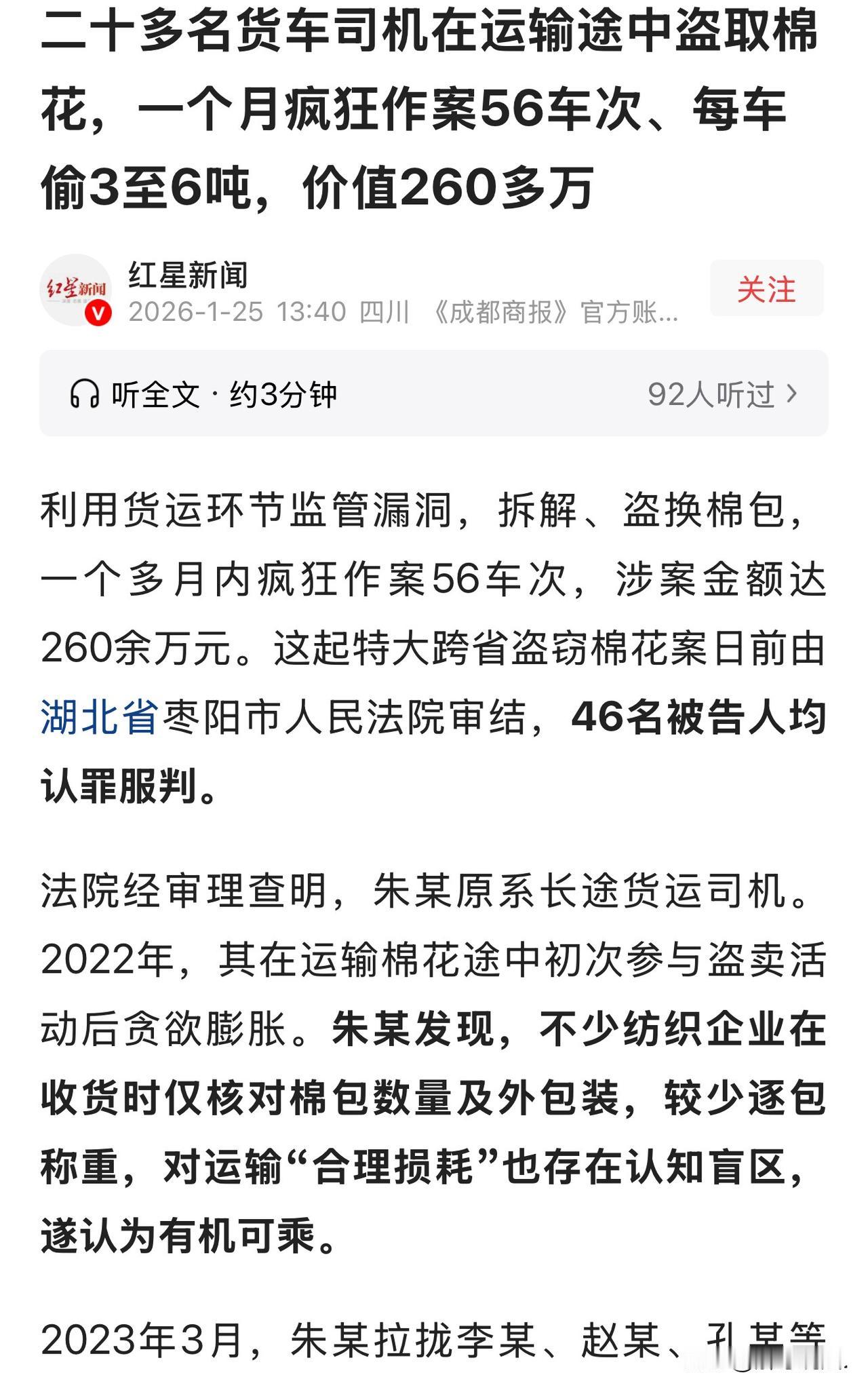 “胆太肥了!”湖北襄阳,男子在某企业负责搬运工作,一日,企业到货3车棉花,男子在用叉车司机搬运过程中,发现每包棉花比以往的轻不少,他赶紧向仓库负责任反应了情况,可负责人一番检查后,发现没什么问题。男子相信自己的直觉不会出错,在第二日,又向企业领导反映情况,领导很重视,再次检查后,竟发现每包少了50公斤重量,每车少7吨,3车共计损失30多万。领导马上报警,结果真相让所有人惊掉下巴! 李师傅是叉车司机,在某企业负责搬运工作。 这日,李师傅负责卸到货的3车棉花。 在卸货过程中,李师傅发现不对劲。 他握着着叉车抱夹操作杆,感受到夹取力道就察觉不对。 他发现夹到预定位置仍松垮垮的,像随时会滑落,敏锐的察觉到这包棉花比正常的要轻很多。 又卸了没几包后,李师傅更加确定了自己的猜测。 这批棉包比同规格的轻不少,他第一时间向仓库管理员反映。 管理员赶紧核对送货单和棉包编号,可发现手续正规、编号清晰,现场检查棉包数量够数、外观整齐无破损,没异常情况,便认定是李师傅手感出错了。 无奈之下,李师傅只好按规矩将三车棉花全卸完归置。 回到家后,李师傅还是对三车棉花心存疑虑,认为自己的感觉不会有错。 本着负责任的态度,第二天,一上班就把疑虑告知企业负责人。 负责人立刻组织抽查称重,结果令人震惊:每包棉花竟少了50公斤左右。 棉花运输中几公斤误差属正常,50公斤的差距明显异常,负责人当即报警。 民警到场后细致检查,发现每包棉花封口处有二次焊接痕迹。 原来犯罪分子抽走部分棉花后重新焊封,从外表难以察觉。 经清点,三车棉花每车少7吨左右,企业直接损失超30万元,线索指向负责运输的三名货车司机。 民警找李师傅了解情况时,却发现他神色躲闪、欲言又止。 后续得知,卸完货当天,三名司机曾邀李师傅吃饭,他随口提及棉包偏轻,司机露馅后拿现金封口,被李师傅坚决拒绝。因担心报复又心怀愧疚,李师傅起初才不敢直言。 有了李师傅的关键证词,案件迅速突破。 民警深挖发现,这是以三名司机为首的犯罪团伙所为,他们钻货运监管漏洞,一个多月内疯狂作案56车次,涉案金额达260余万元。 团伙包含24名货车司机和11名打包焊接人员,形成完整盗窃链条。 《刑法》第264条规定,盗窃公私财物,数额特别巨大或者有其他特别严重情节的,处十年以上有期徒刑或者无期徒刑,并处罚金或者没收财产。 本案中,24名货车司机和11名改包人员形成盗窃链条,涉案金额高达260余万元,远超“数额特别巨大”的认定标准(通常为30万元以上),完全符合盗窃罪的构成要件。 日前案件审结,24名涉案货车司机因盗窃罪获刑一年五个月至拘役六个月,均适用缓刑并处罚金;11名改包人员因相关罪名获刑三年至二年,同样适用缓刑并处罚金。 46名被告人均认罪服法,判决已生效。 这件事中李师傅作为老司机,他凭职业敏感发现棉包异常,没因管理员的质疑就放弃,反而坚持自己的判断,这种责任心太难得了。 更难得的是,面对司机的现金封口,他守住底线坚决拒绝,没被不义之财冲昏头。 反观那伙犯罪分子,为了钱铤而走险,搞起完整的盗窃链条,以为能瞒天过海,最终还是栽了。 这也提醒企业,货运监管不能只看手续和外观,重量抽检这些关键环节不能少,不然容易给不法分子可乘之机。 说到底,做人做事都得守规矩、有底线。 李师傅凭良心办事,既帮企业挽回了损失,也让犯罪分子受到了应有的惩罚。 而那些妄图走歪路的人,终究逃不过法律的制裁,真是得不偿失。 踏实做事、清白做人,才是最稳妥的选择。