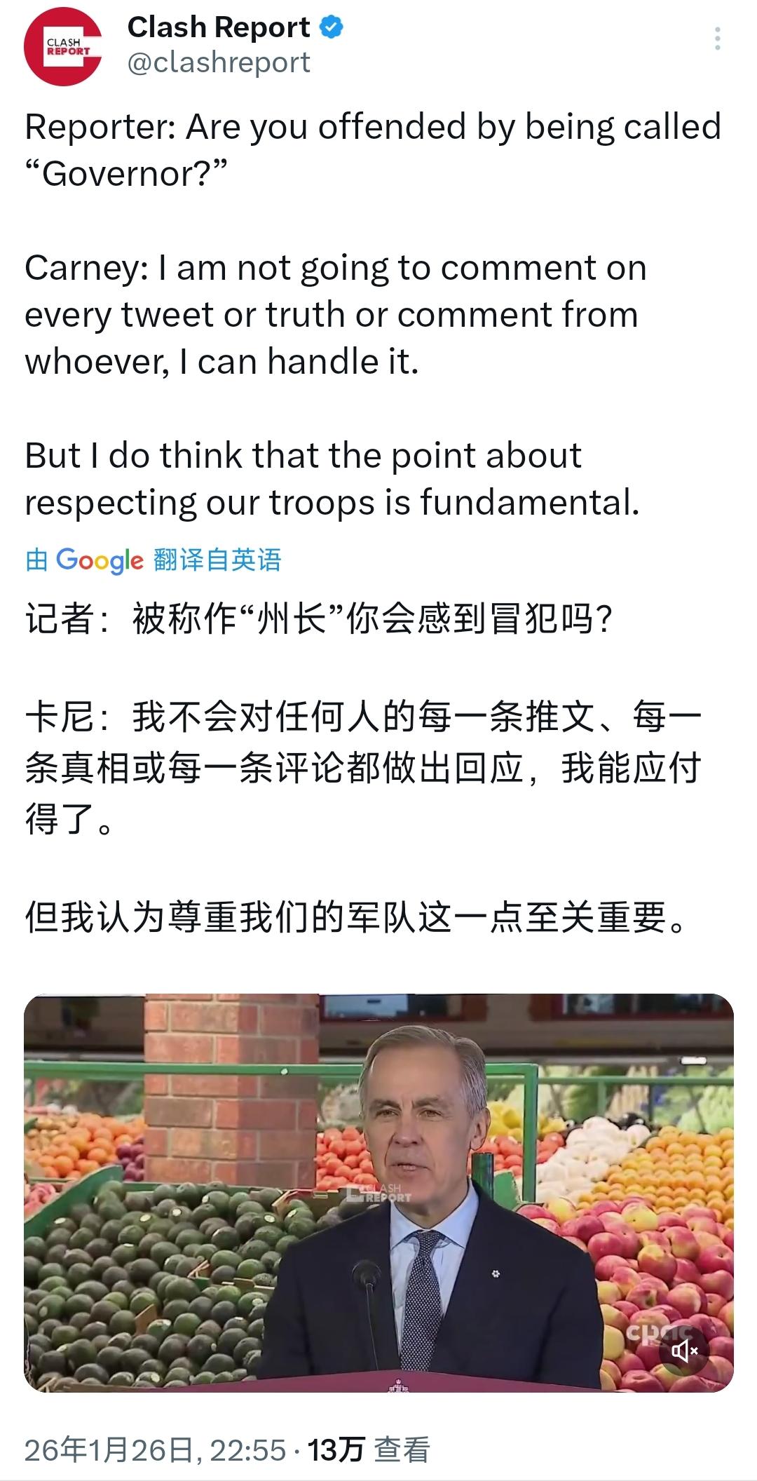 记者:被称作“州长”你会感到冒犯吗? 加拿大总理卡尼:我不会对任何人的每一条推文