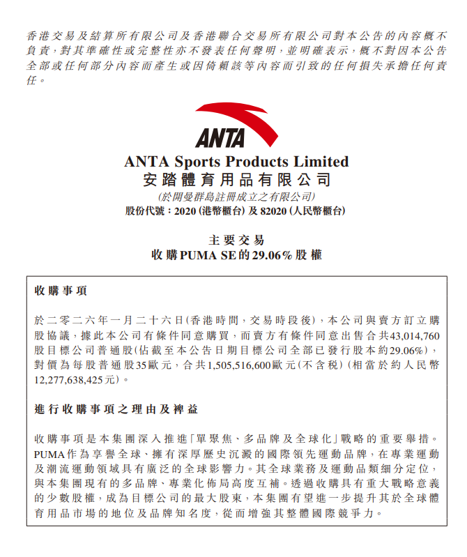 1月27日,安踏体育(02020.HK)公告称,收购彪马公司(PUMASE)29.06%股权,对价为每股普通股35欧元,合共1,505,516,600欧元(不含税)(相当于约人民币12,277,638,425元)。