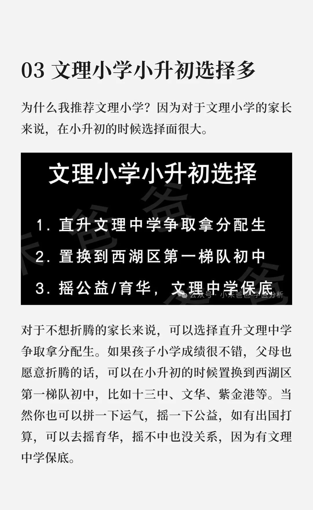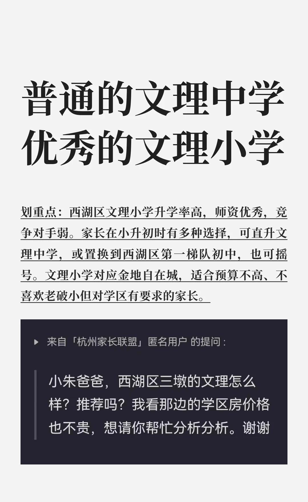 普通的文理中学优秀的文理小学 西湖区文理小学升学率高,师资优秀,竞争对手弱。家长在小升初时有多种选择,可直升文理中学,或置换到西湖区第一梯队初中,也可摇号。文理小学对应金地自在城,适合预算不高、不喜欢老破小但对学区有要求的家长。 文理小学 文理中学 三墩学区 西湖学区