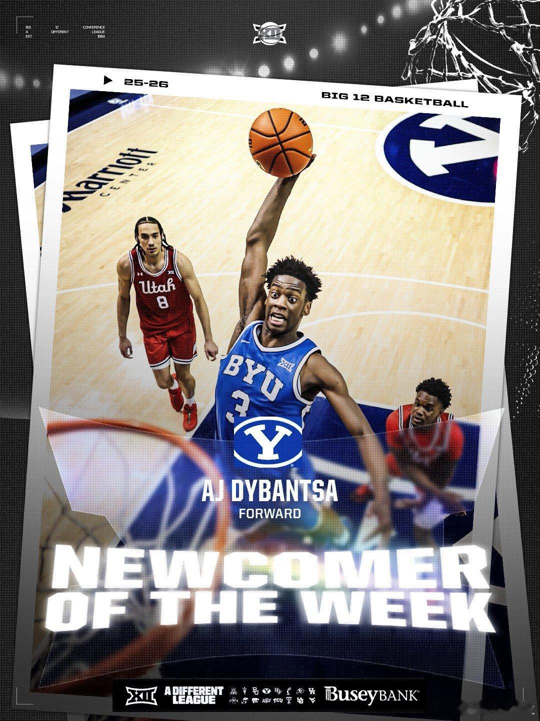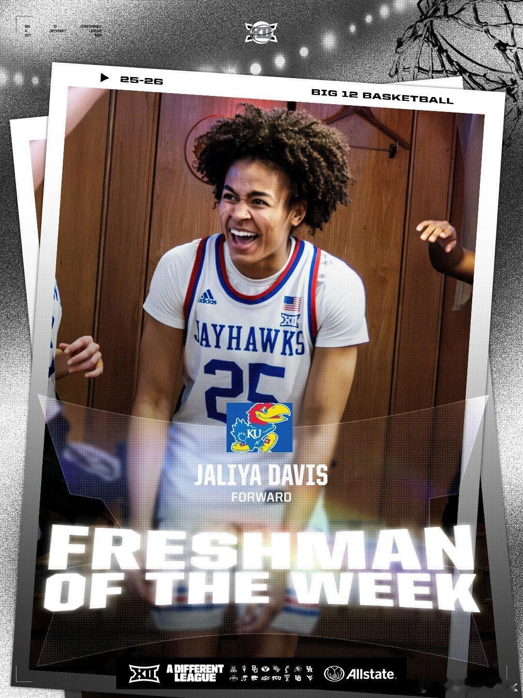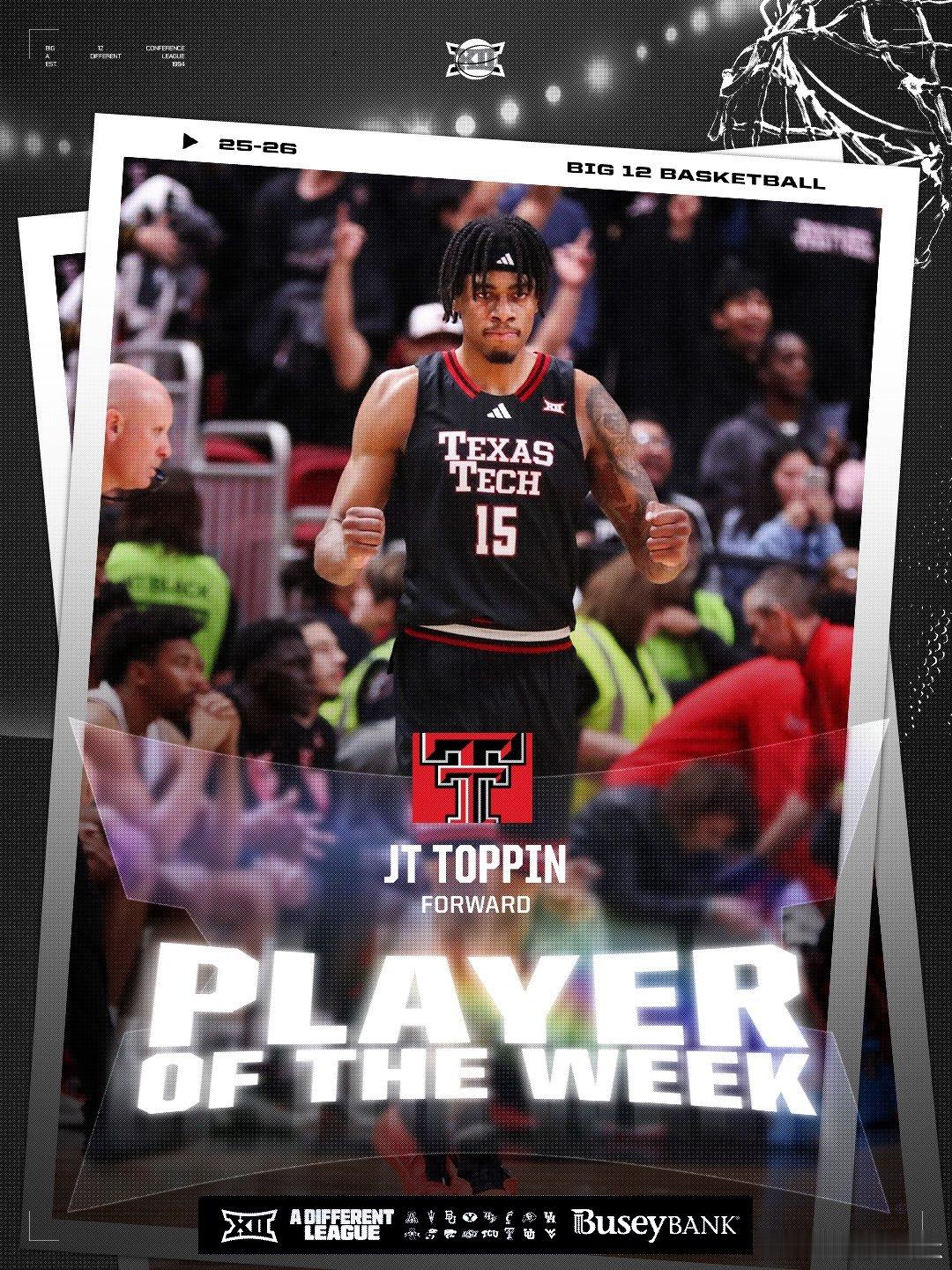 Big 12联盟第12周表现奖(2025-2026赛季)。NCAA男篮 最佳球员:JT Toppin,最佳新生:AJ Dybantsa。NCAA女篮 最佳球员:Jada Williams,最佳新生:Jaliya Davis。