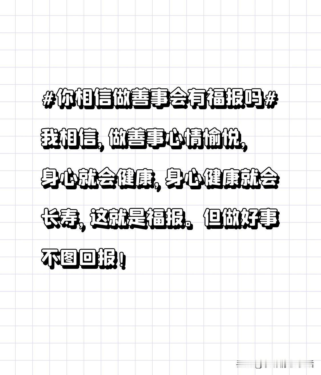 你相信做善事会有福报吗我相信,做善事心情愉悦,身心就会健康,身心健康就会长寿,这就是福报。但做好事不图回报!