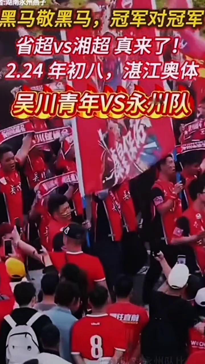 省超VS湘超真来了! 黑马敬黑马,冠军对冠军。 2.24年初八,湛江奥体吴川青年VS永州队。 省超VS湘超真来了!黑马敬黑马,冠军对冠军。
