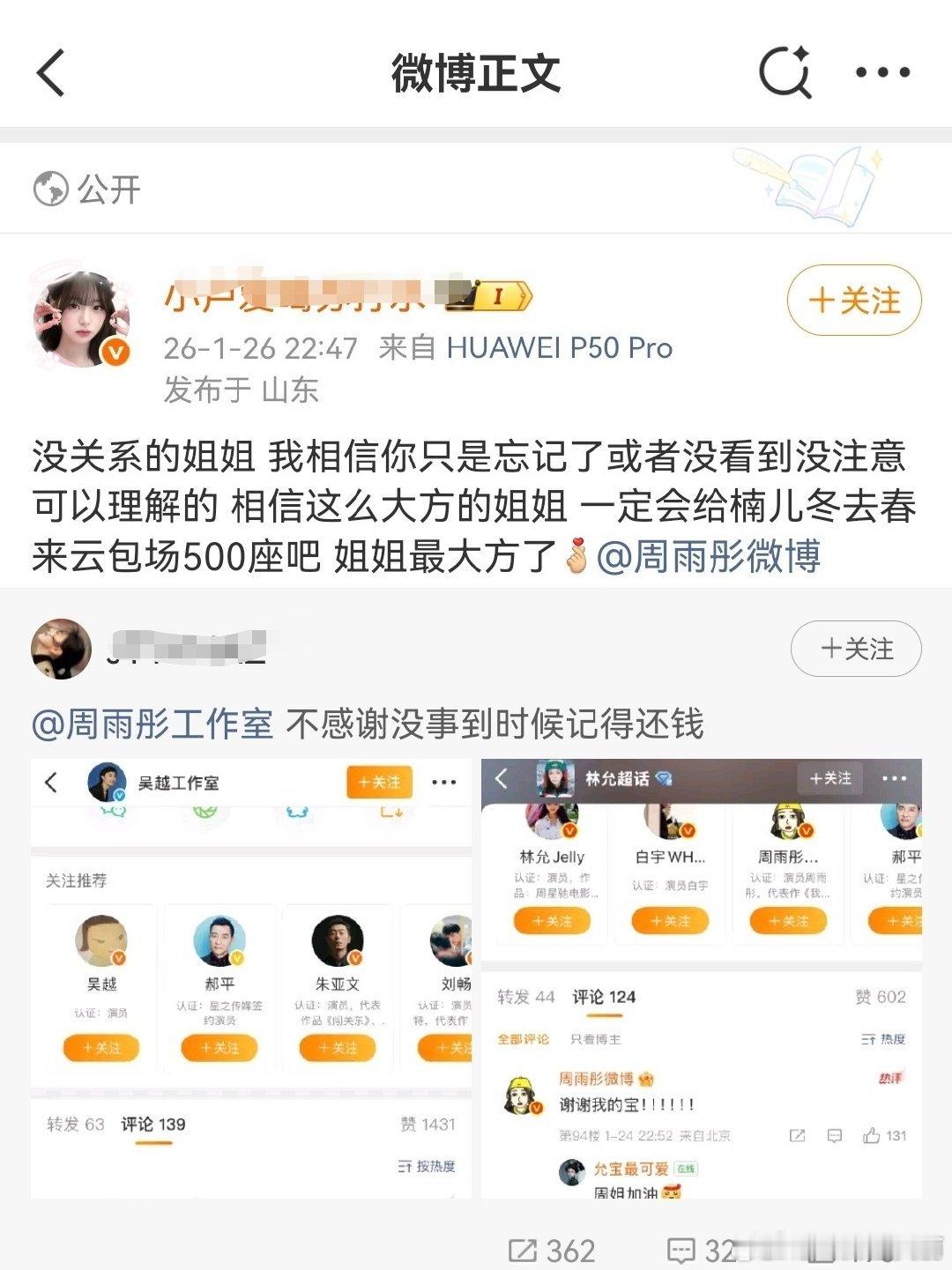 艾玛这种有点尴尬了,周雨彤本人直接回复章若楠粉丝,说一定会给章若楠包场