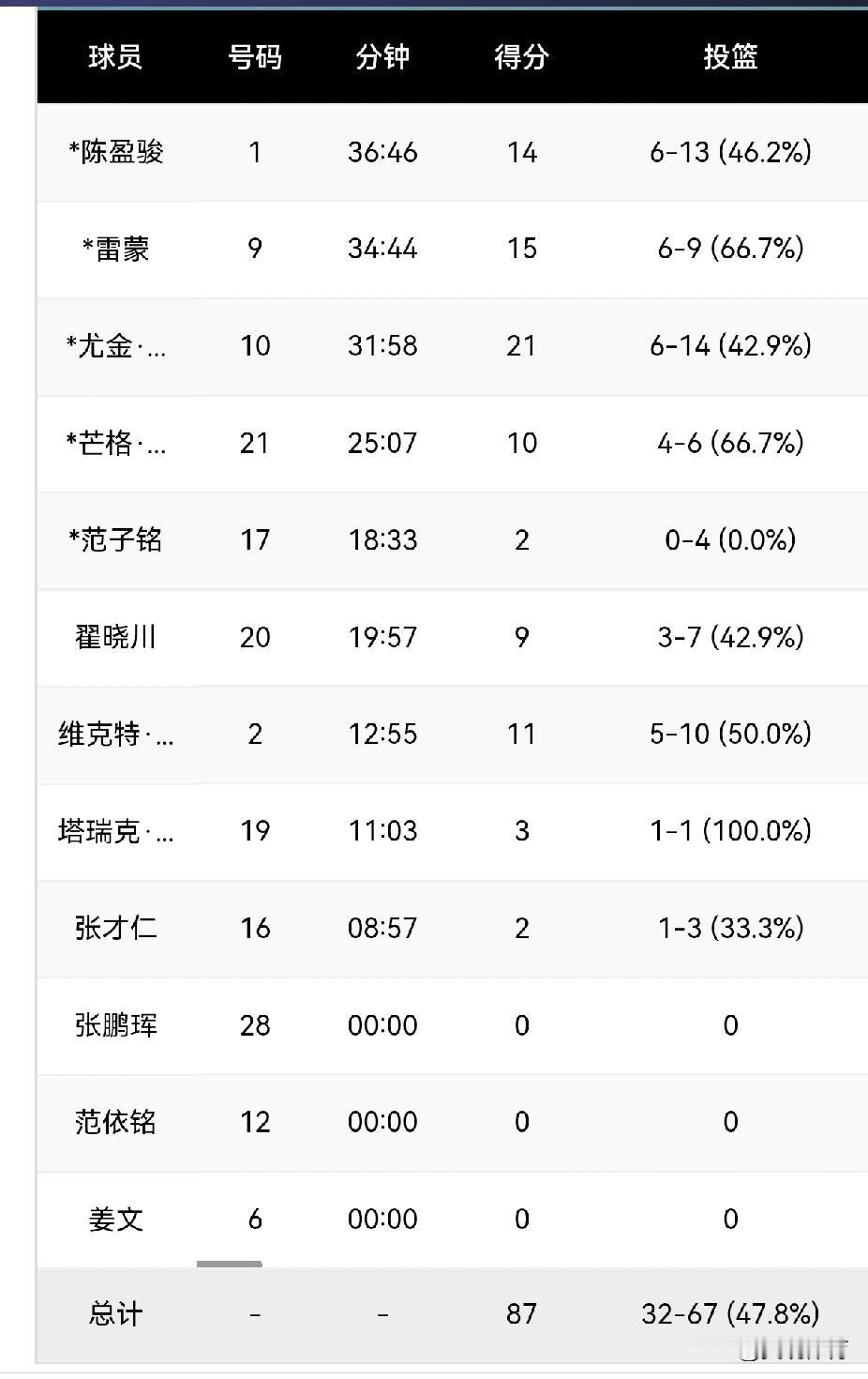 北京现代汽车87:86战胜山西汾酒,在人员不整,周琦、曾凡博等缺席情况下,陈盈骏成为球队获胜的关键! 附图:北京现代汽车球员技术统计
