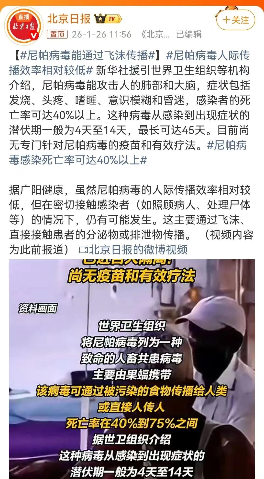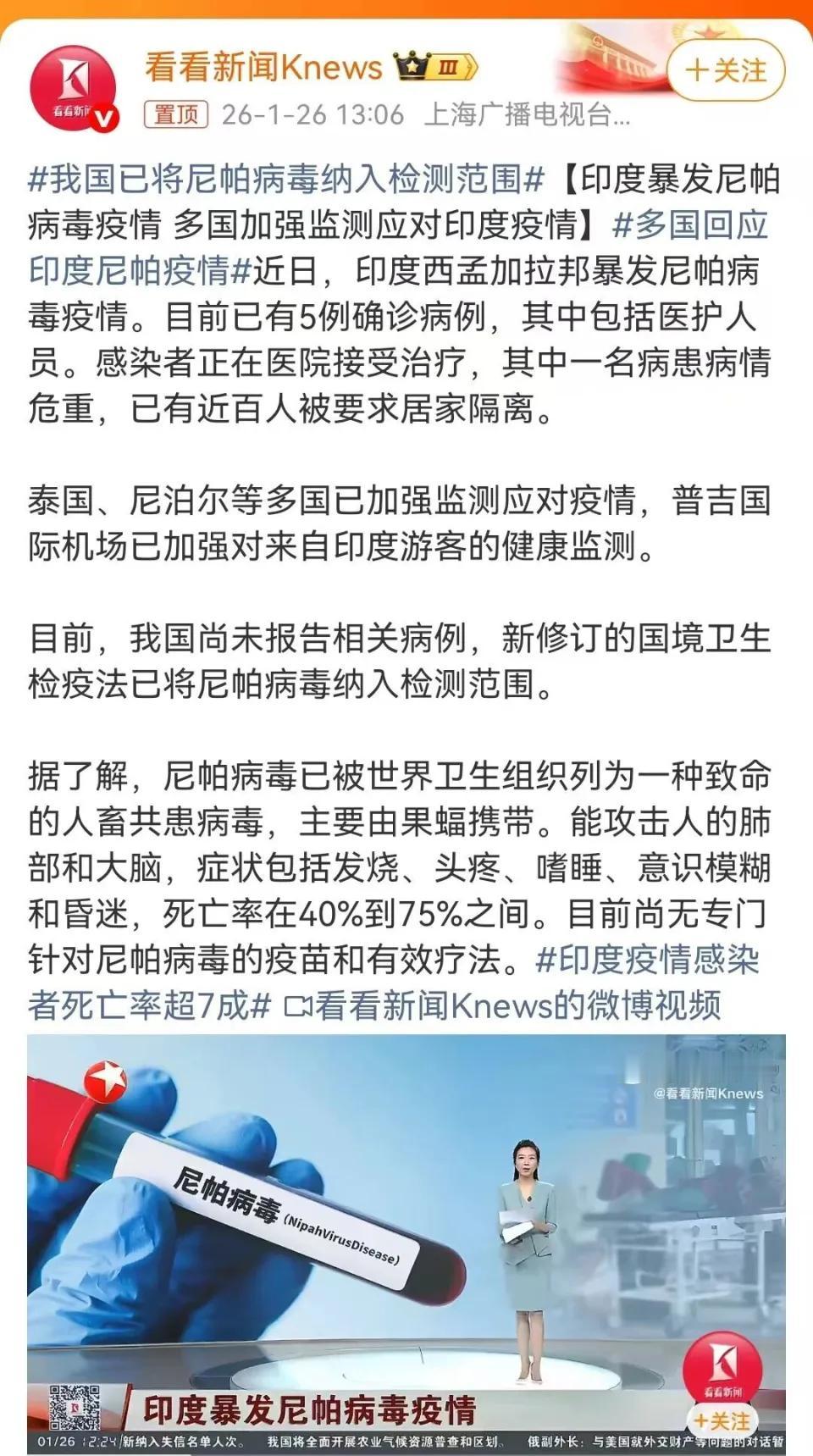 印度西孟加拉邦最近拉响了公共卫生警报,尼帕病毒卷土重来。目前已有多人感染,近百名密切接触者被紧急居家隔离,周边国家如泰国、尼泊尔也火速升级边境检疫措施,严防输入。 这可不是普通传染病。尼帕病毒的可怕之处在于病死率高达40%到75%,在某些暴发案例中,甚至出现过极端情况。更令人揪心的是,至今全球没有特效药,也没有广泛可用的疫苗,一旦感染,基本只能靠支持治疗硬扛。 尼帕病毒主要通过果蝠传播,也可经由受污染的食物(比如被蝙蝠啃过的水果)或人际接触扩散。患者初期症状类似流感,发烧、头痛、呕吐,但很快会发展为脑炎、昏迷,甚至呼吸衰竭。潜伏期短、进展快,防控窗口极窄。 此次疫情发生在人口稠密的西孟加拉邦,当地医疗资源本就紧张,若控制不力,极易引发社区传播。而南亚地区人员流动频繁,跨境务工、朝圣、贸易往来密集,给区域防疫带来巨大压力。 这不是印度首次暴发尼帕疫情。过去二十年,该国喀拉拉邦、西孟加拉邦等地多次出现病例,但因缺乏持续投入,监测体系和应急响应始终薄弱。如今病毒再度现身,暴露的不仅是卫生短板,更是全球对“被忽视热带病”的长期漠视。 面对如此高致死率的病毒,光靠边境堵截远远不够。国际社会需加快疫苗研发,建立区域联防机制。 在病毒面前,没有国界,只有人类共同体。