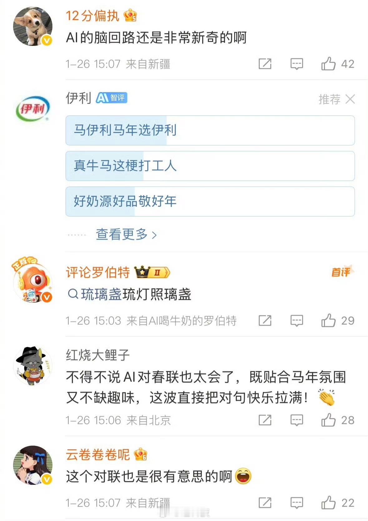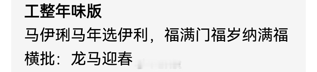 马年春联已进入AI时代 不得不说,今年马年最出圈的春联上联,当属那句“马伊琍马年选伊利”,真的太会玩了!一句上联把马年、巧思完美融合,趣味拉满,难怪瞬间引发全网网友的对句热情。评论区的下联内容丰富到超乎想象,有人玩谐音梗,有人讲究对仗工整,有人结合年味送祝福,每一句都藏着网友的巧思。简简单单一句上联,让大家在对对联的过程中感受年味,也让马年的新春多了一份全民参与的欢乐,这波真的太会整活了! 马伊琍马年选伊利