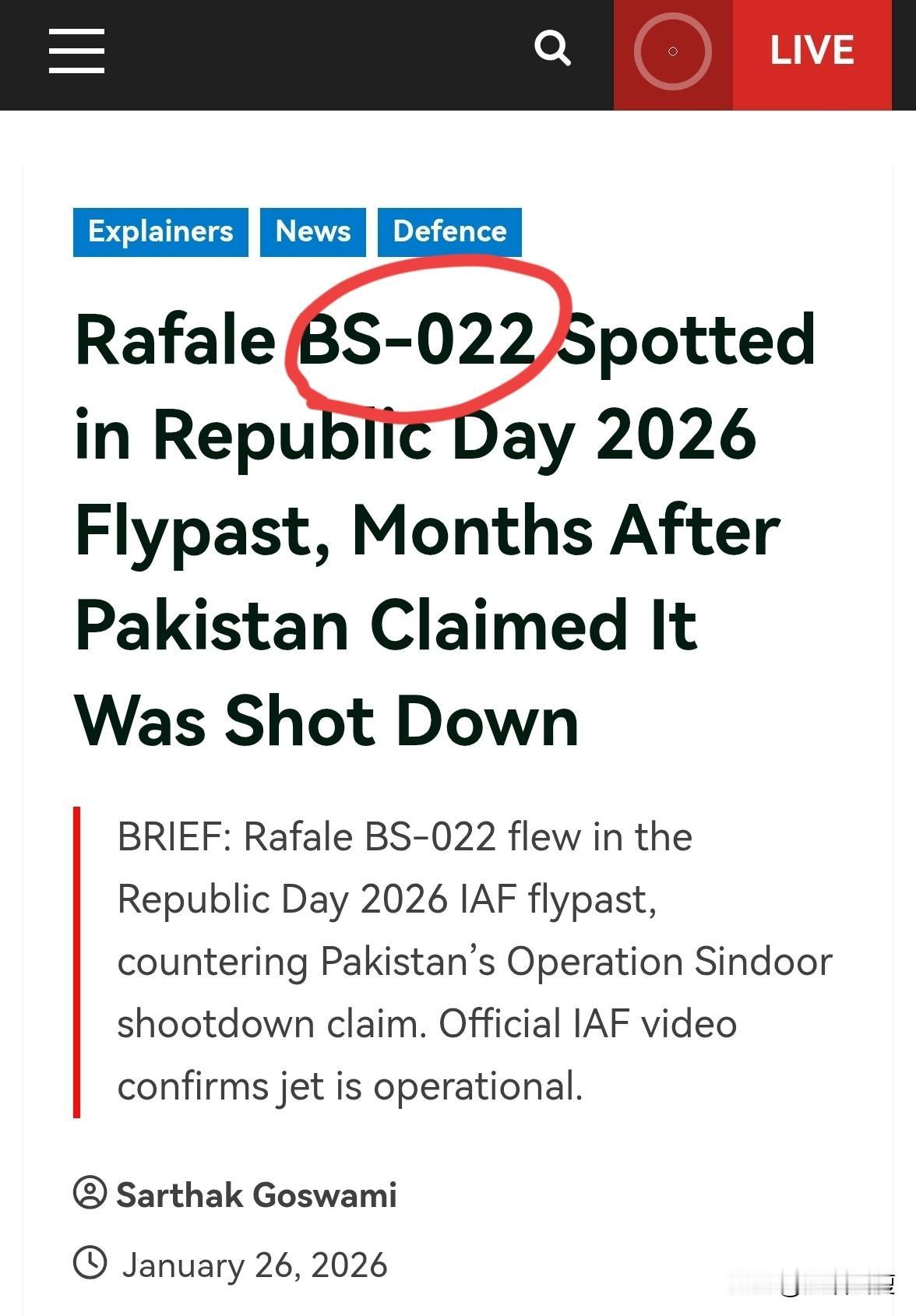 印度人全在欢呼!那架阵风被击落后数月,突然出现在印度共和国阅兵式上。 此前被多方确认已击落(印度空军千方百计不承认)的阵风,垂直尾翼上尾号BS-22,在昨天的阅兵式上突然出现,多家印度电视台给了直播镜头。 【原来你一直都在!为什么不跟我们报平安!】是啊印度在战机坠落后千方百计试图证明这架BS-22没事,当时直接拉出来遛一遛不就没这么些事儿了嘛。 那是什么阻扰印度空军这么做呢?[笑哭]是漆干得没那么快吗?