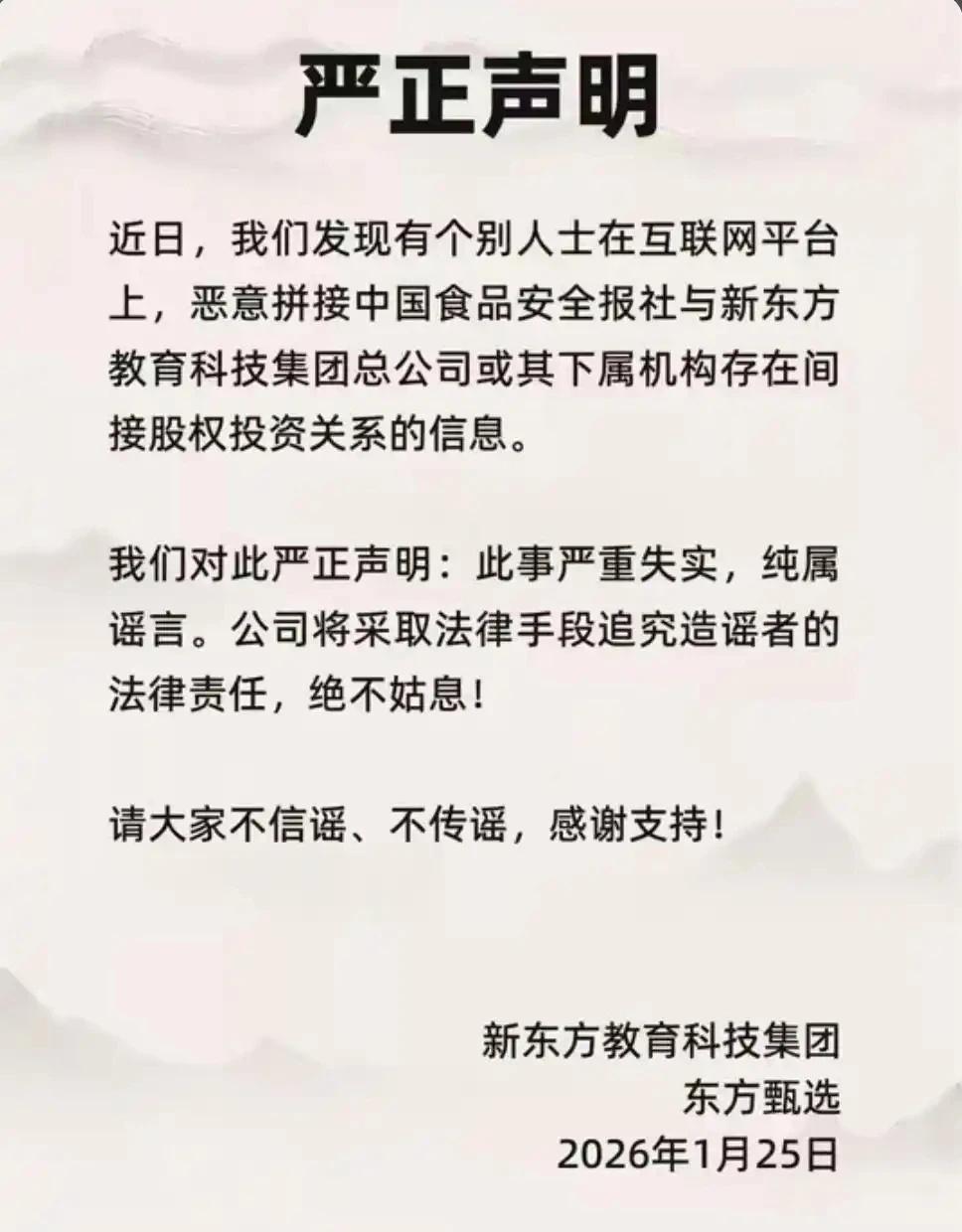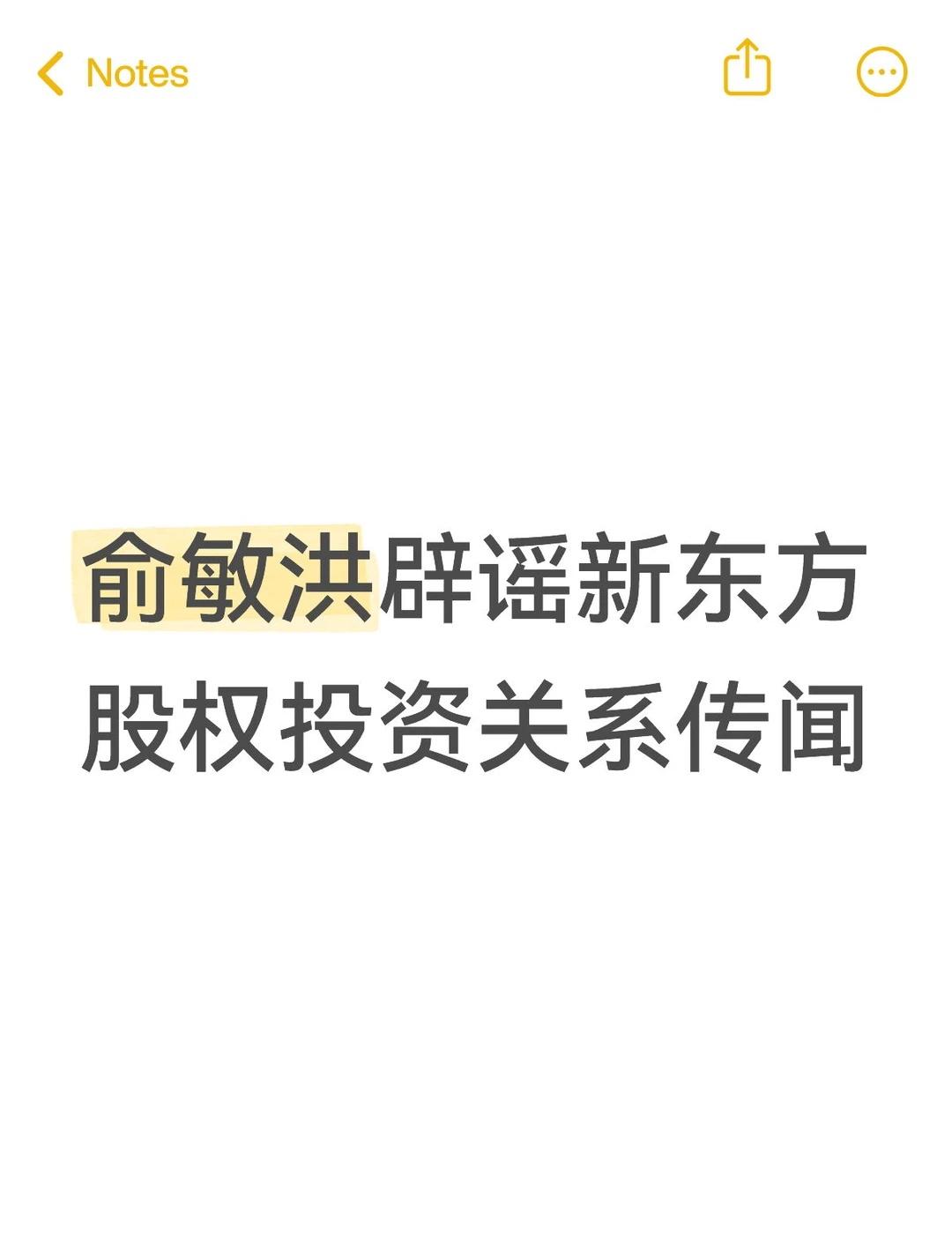 俞敏洪辟谣新东方股权投资关系传闻 新东方创始人俞敏洪于1月26日发布声明,对近期网络流传的“中国食品安全报社与新东方存在间接股权投资关系”的信息进行正式辟谣。 声明指出,该信息系个别人士恶意编造的不实关联,纯属谣言。并呼吁公众不信谣、不传谣。新东方 俞敏洪 回应 新闻