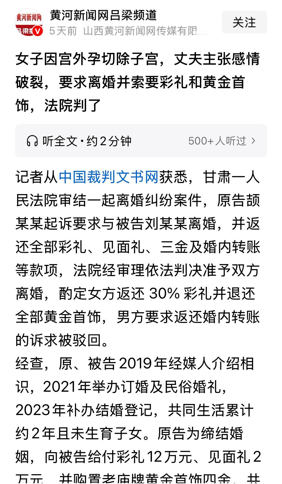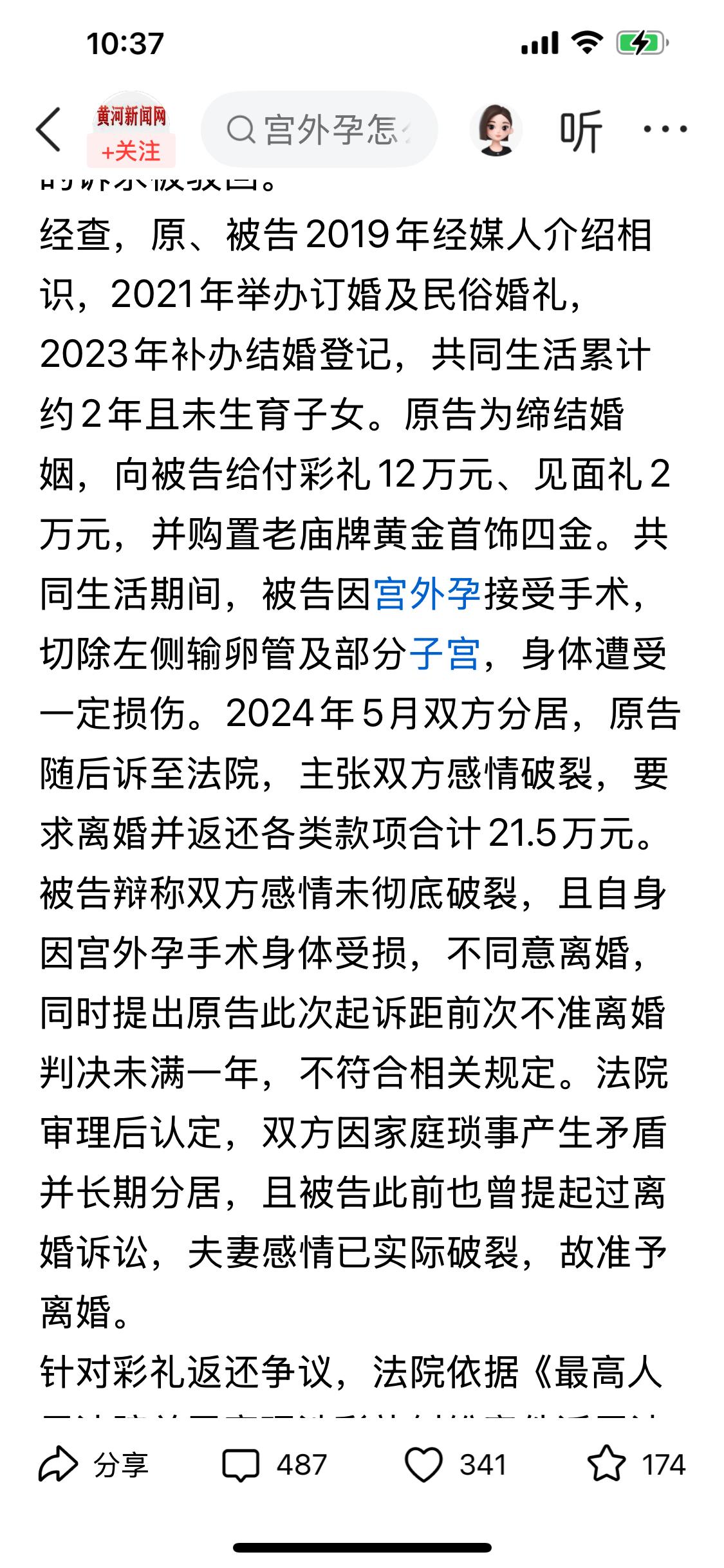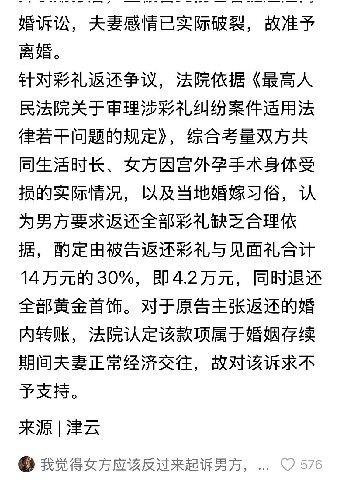 男女结婚5年,女方怀孕宫外孕切除子宫,男方起诉离婚并收回彩礼,法院判归还30%彩礼,退还金首饰! 有人说,只有分手的时候才能看清另一半的嘴脸,真是没错,为什么现在的人总想着拉出来的还得坐回去呢[捂脸]人都要为自己的选择买单,你吃完一桌子菜最后说有苍蝇,那不是想吃霸王餐嘛[捂脸],女的应该告这男的精子没活力,游不到子宫造成宫外孕使女子身体受损,对女子进行赔偿。