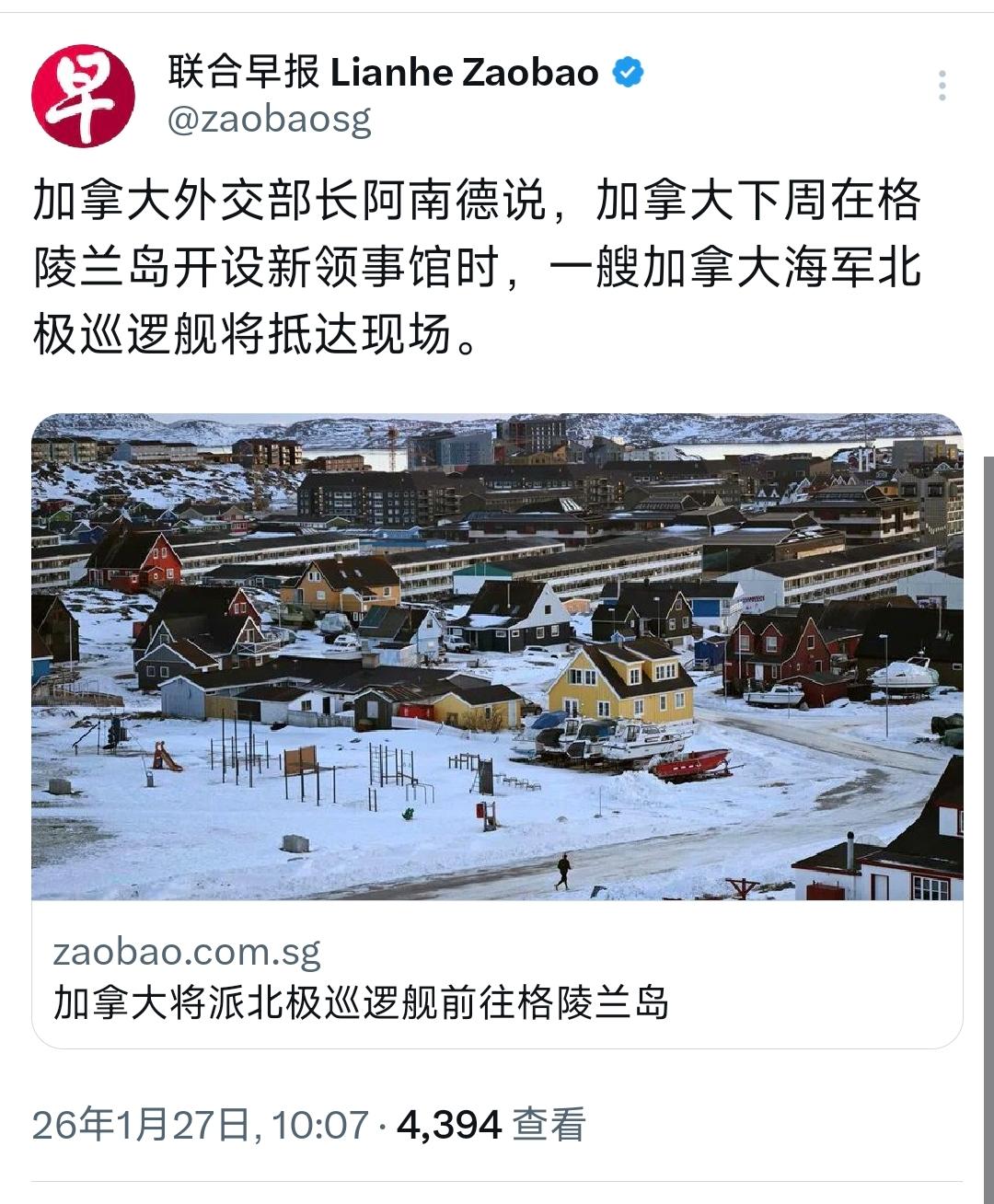 外媒今天(1月27日)报道:“加拿大外交部长阿南德说,加拿大下周在格陵兰岛开设新领事馆时,一艘加拿大海军北极巡逻舰将抵达现场。” [机智]评几句:加拿大卡尼政府派海军巡逻舰赴格陵兰为新领事馆站台,全然是对特朗普情绪上头后的意气用事。加拿大此举看似强硬,实则仅有象征意义,毫无实质威慑力,不过是刷存在感的政治作秀。