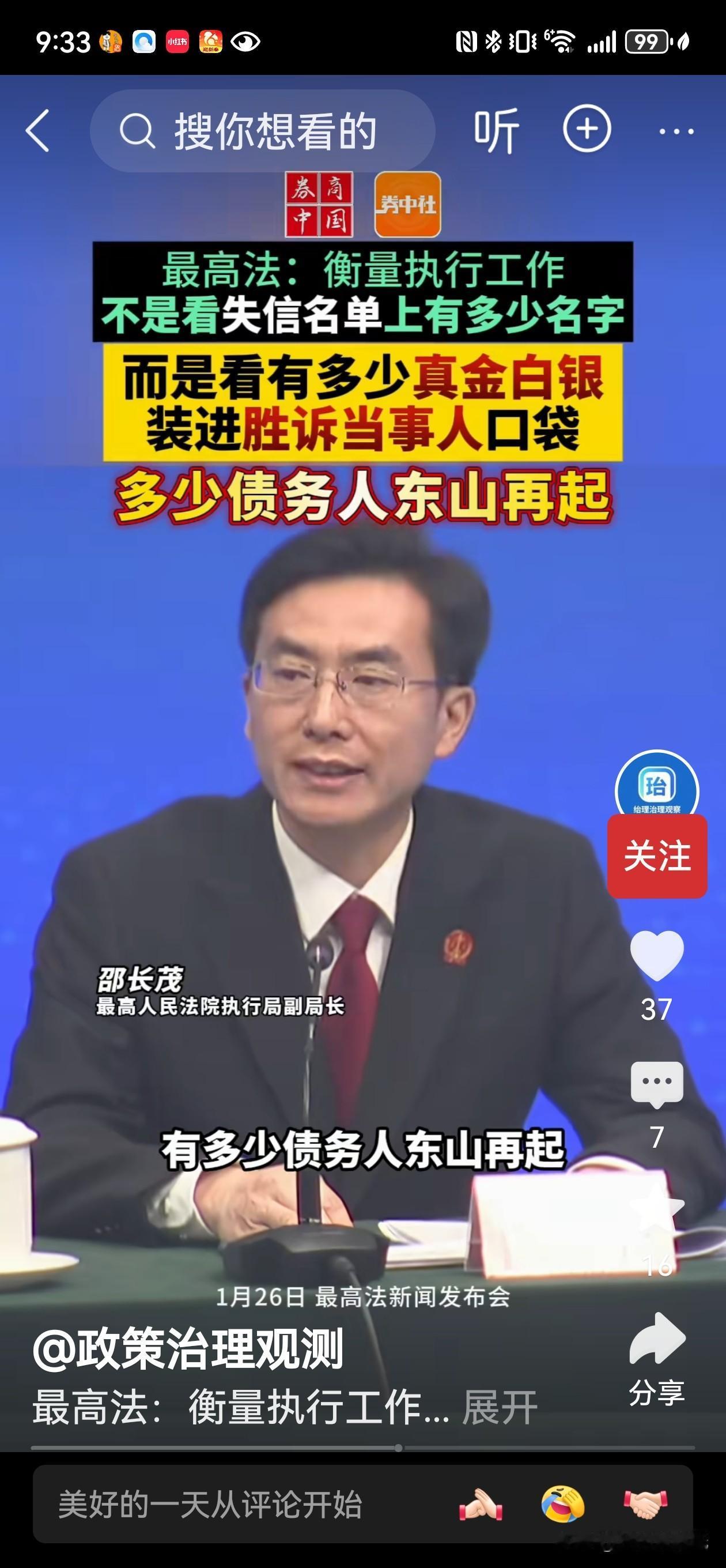 最高法院对执行工作提出新定位,指出,衡量执行工作“不是看失信名单上有多少名字,而是看有多少真金白银装进胜诉当事人口袋,多少债务人东山再起、重获发展机会,有没有涵养出履约践诺、文明守诺的文明风尚!”这番话直面问题、掷地有声,清晰传递出人民法院在执行理念上的重要转变。 评几句: 这体现了一种不图形式、务实为民的司法导向。一方面,法院狠抓执行,全力兑现胜诉权益,避免法律判决成为“一纸空文”;另一方面,也注重“放水养鱼”,为确有履行意愿但暂时困难的债务人留出再生空间。这不仅有助于实现个案公正,更能促进债务化解、营商优化与社会诚信建设,彰显了司法在维护权益与保障发展之间的平衡智慧。