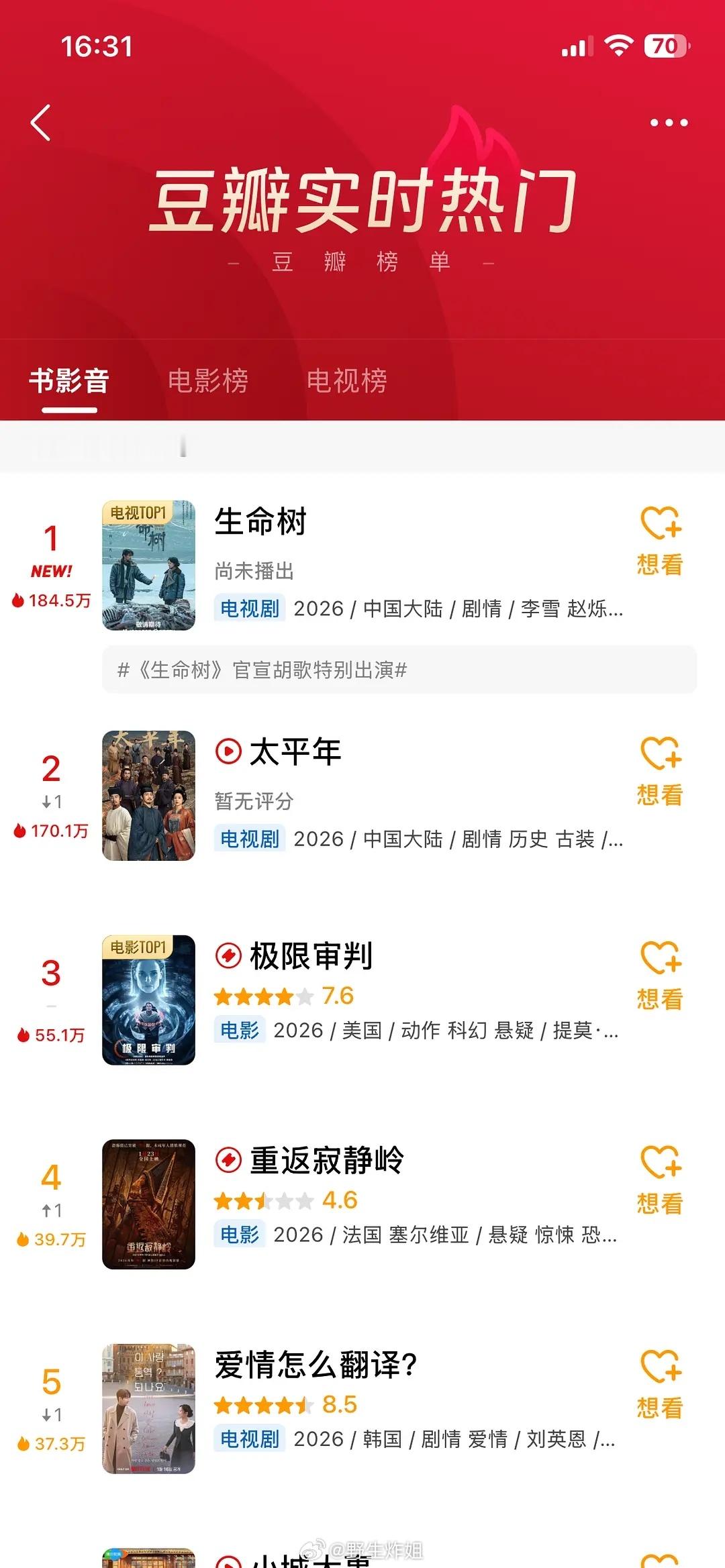 《生命树》未播登顶第1 这有点儿牛的