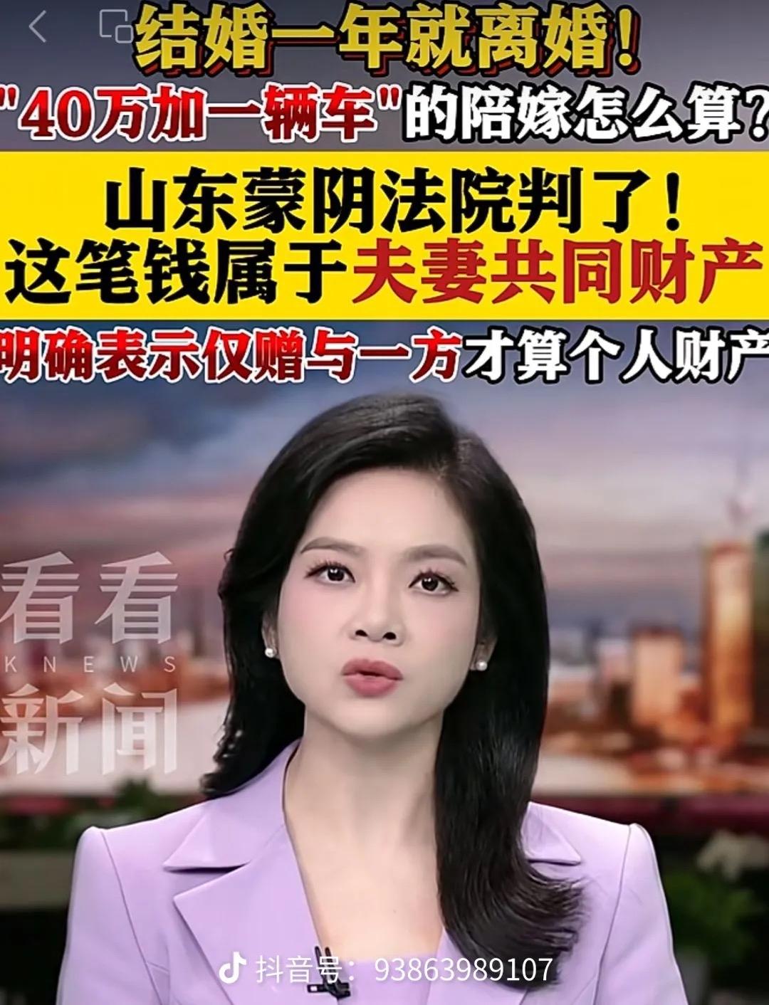 山东蒙阴这离婚案,真给未婚的人浇了盆冷水!女方结婚娘家陪40万+一辆车,才一年离婚,想拿回来却被法院判成夫妻共同财产,男方也能分,就因为没明确说这是只给女方的个人陪嫁。 别再傻傻觉得陪嫁天然是自己的,法律上婚后的赠与,没特殊说明就是共同的!反观彩礼,没结成婚还可能被要求返还,这对比真的太戳心了,也难怪年轻人越来越恐婚。 说到底,不是婚姻太现实,而是婚前没把话说透、没留证据,习俗顶不过法律条文。谈婚论嫁时把财产归属掰扯清楚,不是生分,是给自己留底,别让真心最后栽在糊涂的约定上。 你们觉得,婚前该不该把陪嫁、彩礼的权属白纸黑字写明白?