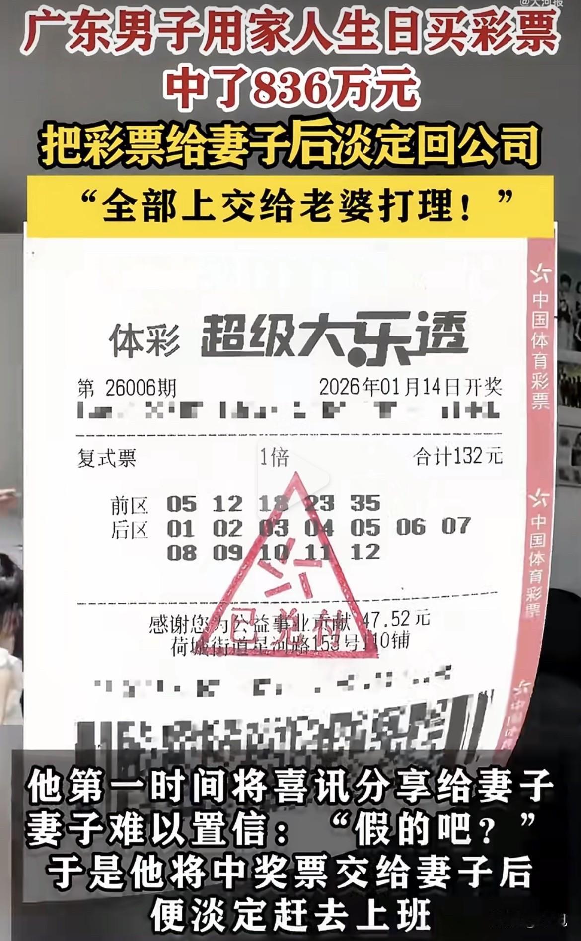 一个电话,妻子以为他在开玩笑。 佛山王先生心跳得厉害,刚在交班吃饭时顺手对了眼开奖号码。屏幕上那串数字,熟得不能再熟——是他用父母、老婆、孩子的生日凑出来的。中了,一等奖,836万。 他马上打给老婆。电话那头,老婆愣了下,脱口而出:“假的吧?” 这反应正常,谁听了都懵。 王先生没在电话里多解释,直接赶回家,把那张轻飘飘的彩票塞到老婆手里。老婆对着看了又看,手有点抖,这下真信了。那一晚,她肯定是睡不着了。 王先生自己呢,缓了口气,转身出了门。他得回去上夜班。 同事谁也没看出来,身边这个工友,兜里刚揣了个天大的秘密。活儿照干,班照上,像什么都没发生。工作成了他当下最实在的“定心丸”。 第二天,两口子一起去体彩中心兑奖。扣完税,实际到手六百多万。工作人员问,这么多钱怎么打算?王先生笑得挺踏实,话也干脆:“全部上交给老婆打理!” 他说自己还会继续努力工作,彩票以后也照买,就当给公益添点儿力,心态一直挺平和。这话不是中奖后才说的。他从2013年就开始买大乐透,每期都买,但从来没指望靠这个发财,就觉得是个小盼头,不中也算是做公益。 这张彩票挺有意思,号码是全家人的生日。看来好运从一开始就和家绑在一起。中了奖,钱交给老婆,是他心里觉得最自然、最妥当的安排。 一夜暴富的梦,很多人做过。真砸到头上,日子反而容易晃荡。王先生不一样,他好像特别清楚,钱是意外,但日子不是。该守的夜班得守,该担的责任得担。 赶回去上班的那个背影,比中奖本身更让人琢磨。那是一种把突然踹开的生活,又一把拉回正轨的力气。 彩票测运气,也更测人。测你接不接得住,测你心里什么最重。 如果是你,中了这么大一笔钱,会第一时间告诉谁?又会怎么安排往后那突然不一样了的日子?