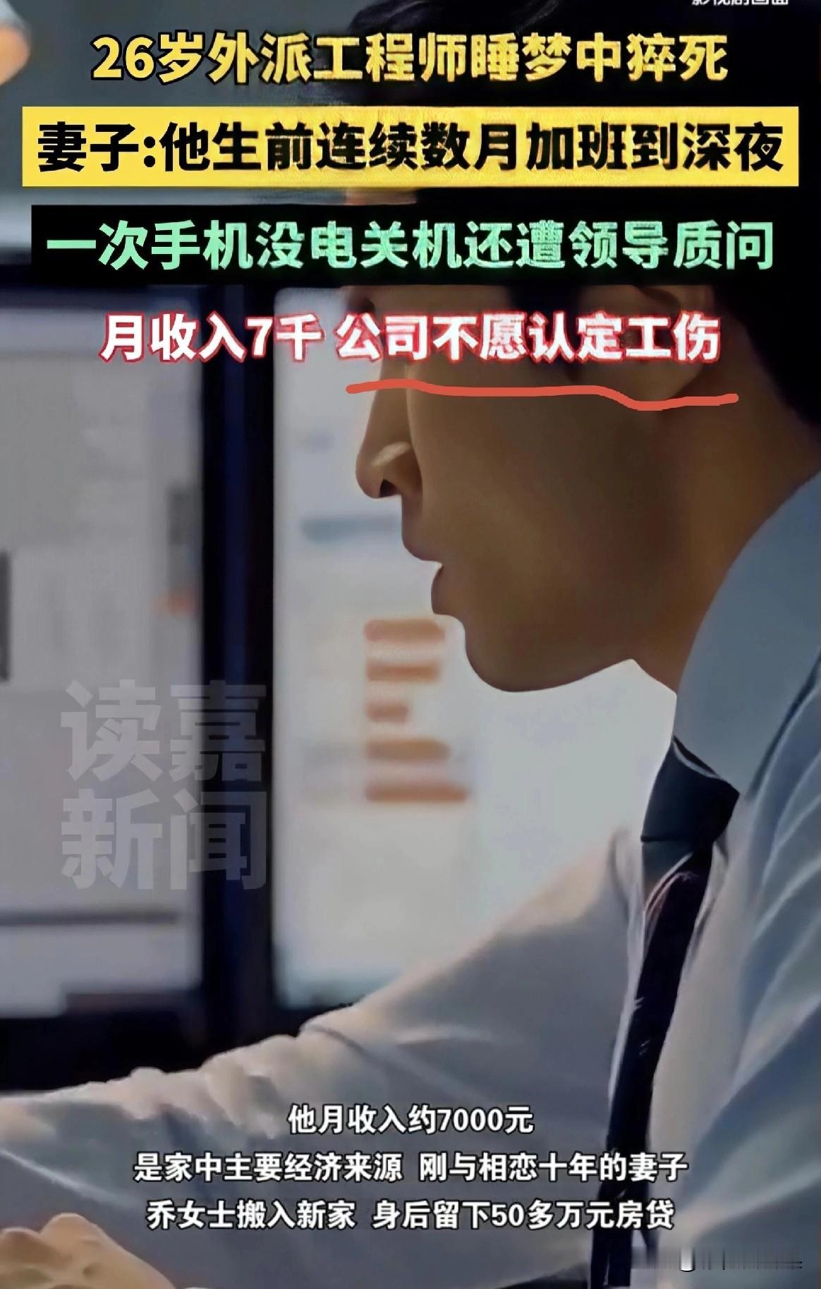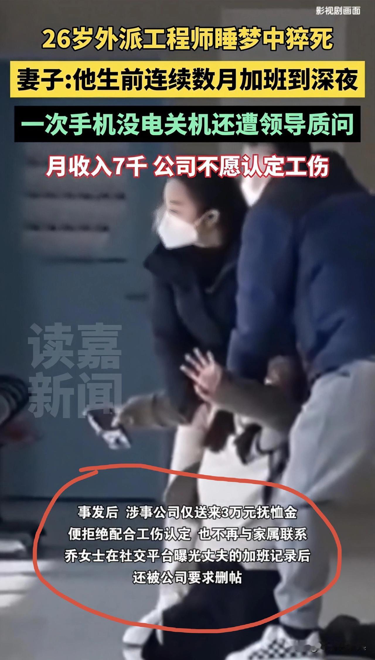 26岁工程师睡梦中猝死!月薪7千扛50万房贷,公司拒认工伤还逼删帖 突发! 26岁外派工程师陈某,连续数月加班到深夜后,在睡梦中猝然离世,留下新婚妻子和50多万的房贷,涉事公司仅支付3万元抚恤金就拒绝配合工伤认定,甚至在妻子曝光加班记录后要求删帖,随后彻底失联! 他是家里唯一的顶梁柱,月薪7000元刚够维持生计,手机没电关机都要被领导质问。事发后,公司只给了3万元抚恤金,就拒绝配合工伤认定,甚至在妻子曝光加班记录后要求删帖,随后彻底失联。 法律明确:外派员工的租住地可视为“工作岗位延伸”,如果能证明猝死前仍在工作,就有机会被认定为工伤。可如今,这位妻子只能独自面对冰冷的法律程序和巨额债务。 50万的房贷压在她一个人身上,法律维权的路又那么长。她只是想为死去的丈夫讨一个公道,怎么就这么难? 每个点赞和转发,都是为打工人撑一把伞。