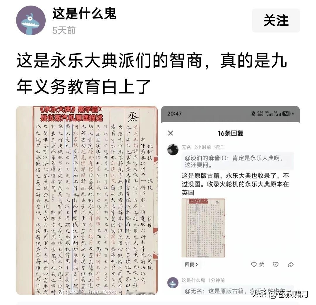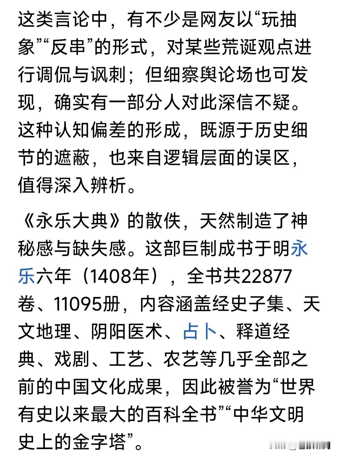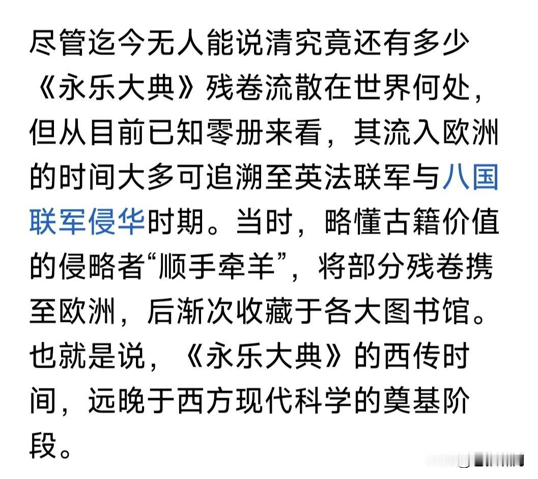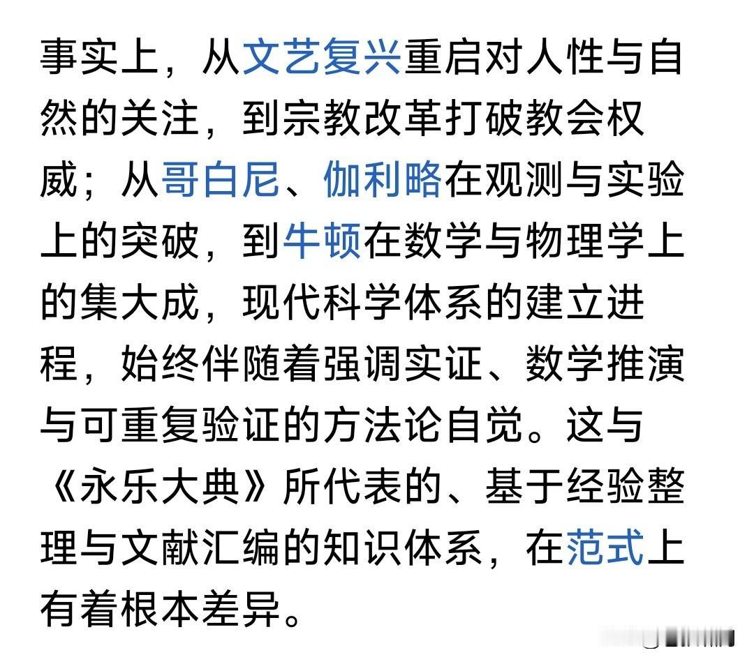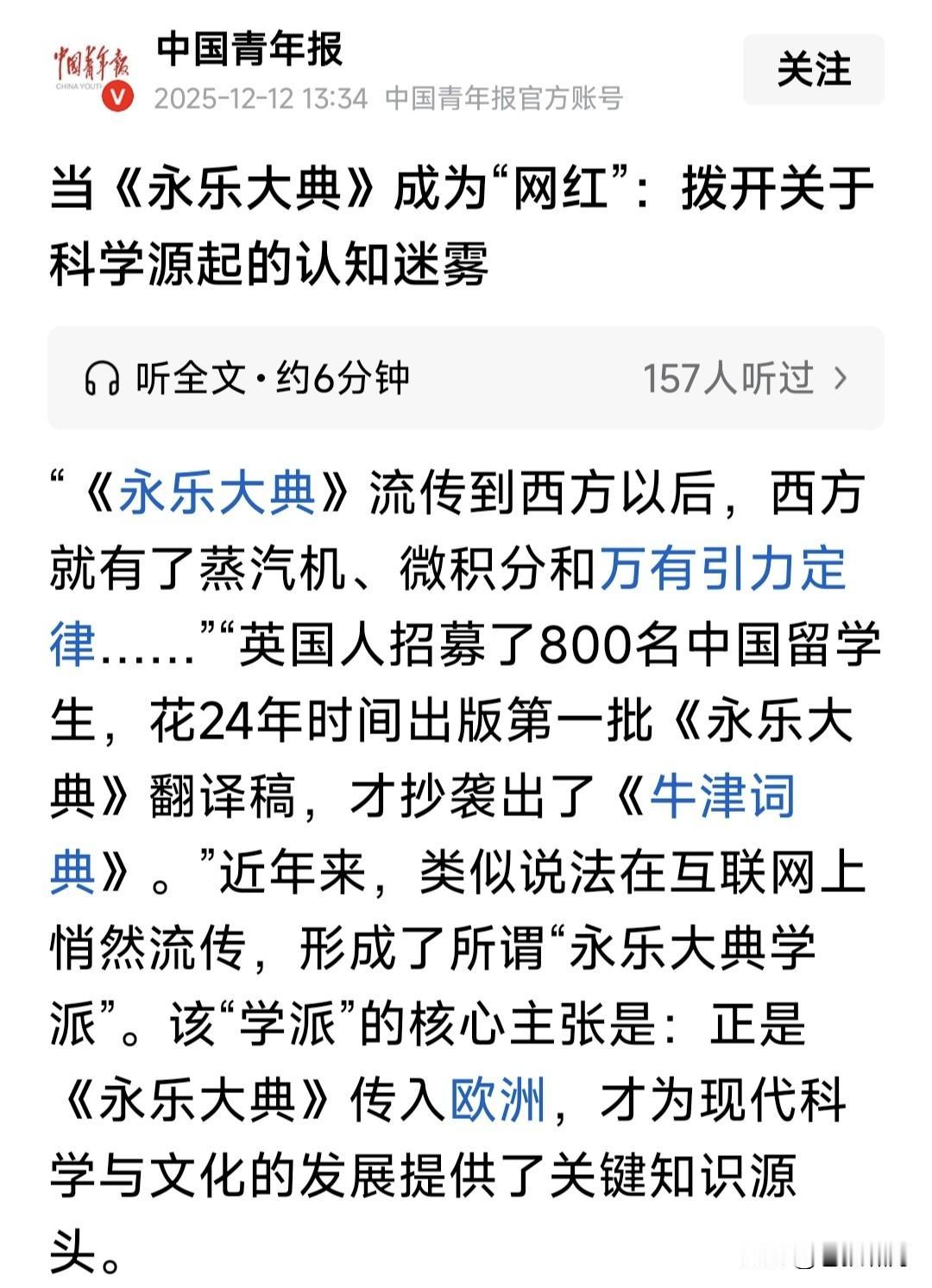 “永乐大典”是西方文明的源头?理由是其流落欧洲之后,西方才有了蒸汽机与微积分,万有引力等科学发明! 英国人招募800名中国留学生,用24年时间,才翻译出一部分“永乐大典”,并改头换面,出版了“牛津词典”! 苍狼看过这个视频,差点惊掉下巴!其中旁征博引牵强附会,肯定西方近代发明,完全是来自于“永乐大典”! 当然也有许多反对的声音!比如这位网友就说:这些“永乐大典派们”的智商,真的是白白浪费了“九年义务教育”! 当然批驳最有力的,还是国家官媒。比如“中青报”就对“永乐大典派”的胡言乱语,进行了全面系统的尖锐批评! 1.“永乐大典”虽篇幅浩瀚,却是中国农耕文化梳理结晶,并非科研著作,与西方人文与自然科学发明毫无关系。 2.表面看“永乐大典”成书于15世纪,西方工业革命与人文自然科学发明,集中出现于16世纪!但两者内容截然不同,且西方文明奠基时间早于15世纪。 3.我们不能妄自菲薄,否定中国历史文化丰硕成果!更不能妄自尊大,否认西方近代人文与自然科学,创新发明巨大成就。任何否认都非实事求是,是一种不健康心态,影响我们创新发展! 以上三点,是“中青报”批驳“永乐大典派”论调的重点内容。苍狼十分赞同。也有网友贴出中国清朝乾隆时期,西方诞生人文科学巨著令人叹为观止! 不多说了!网友若有兴趣,请看附录“中青报”的文章,相信会对你有启发。另外还想问网友一句:大家谁了解“永乐大典”内容?谁读过这些西方近代人文著作?读没读没关系,有数就好! …………