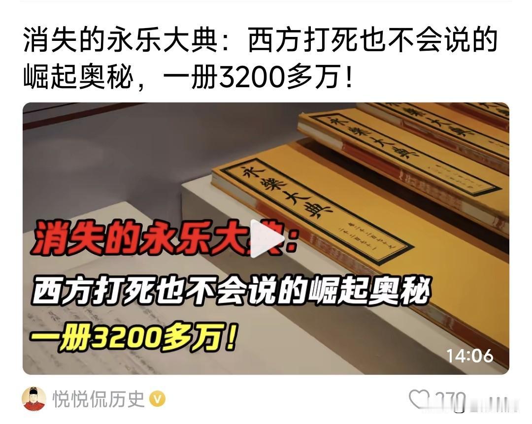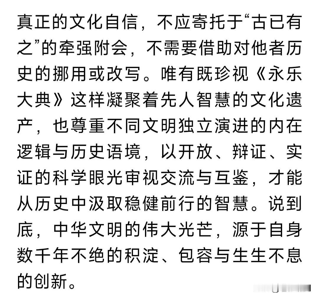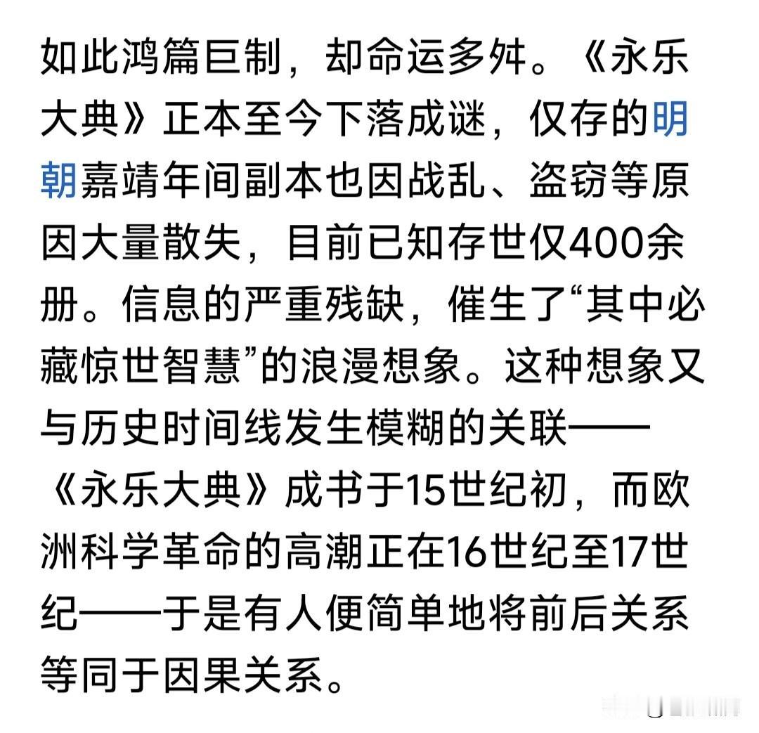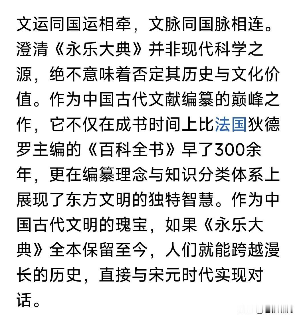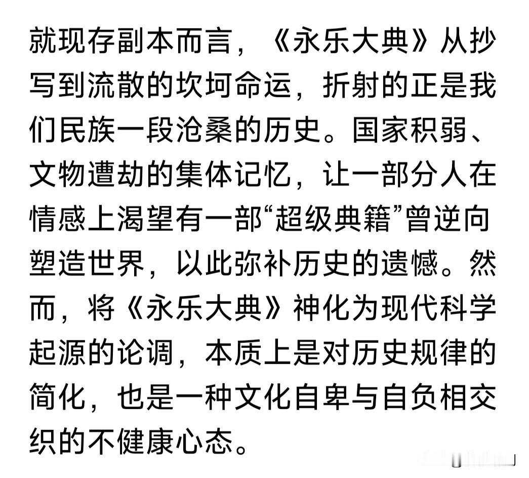 “永乐大典”是西方文明的源头?理由是其流落欧洲之后,西方才有了蒸汽机与微积分,万有引力等科学发明! 英国人招募800名中国留学生,用24年时间,才翻译出一部分“永乐大典”,并改头换面,出版了“牛津词典”! 苍狼看过这个视频,差点惊掉下巴!其中旁征博引牵强附会,肯定西方近代发明,完全是来自于“永乐大典”! 当然也有许多反对的声音!比如这位网友就说:这些“永乐大典派们”的智商,真的是白白浪费了“九年义务教育”! 当然批驳最有力的,还是国家官媒。比如“中青报”就对“永乐大典派”的胡言乱语,进行了全面系统的尖锐批评! 1.“永乐大典”虽篇幅浩瀚,却是中国农耕文化梳理结晶,并非科研著作,与西方人文与自然科学发明毫无关系。 2.表面看“永乐大典”成书于15世纪,西方工业革命与人文自然科学发明,集中出现于16世纪!但两者内容截然不同,且西方文明奠基时间早于15世纪。 3.我们不能妄自菲薄,否定中国历史文化丰硕成果!更不能妄自尊大,否认西方近代人文与自然科学,创新发明巨大成就。任何否认都非实事求是,是一种不健康心态,影响我们创新发展! 以上三点,是“中青报”批驳“永乐大典派”论调的重点内容。苍狼十分赞同。也有网友贴出中国清朝乾隆时期,西方诞生人文科学巨著令人叹为观止! 不多说了!网友若有兴趣,请看附录“中青报”的文章,相信会对你有启发。另外还想问网友一句:大家谁了解“永乐大典”内容?谁读过这些西方近代人文著作?读没读没关系,有数就好! …………