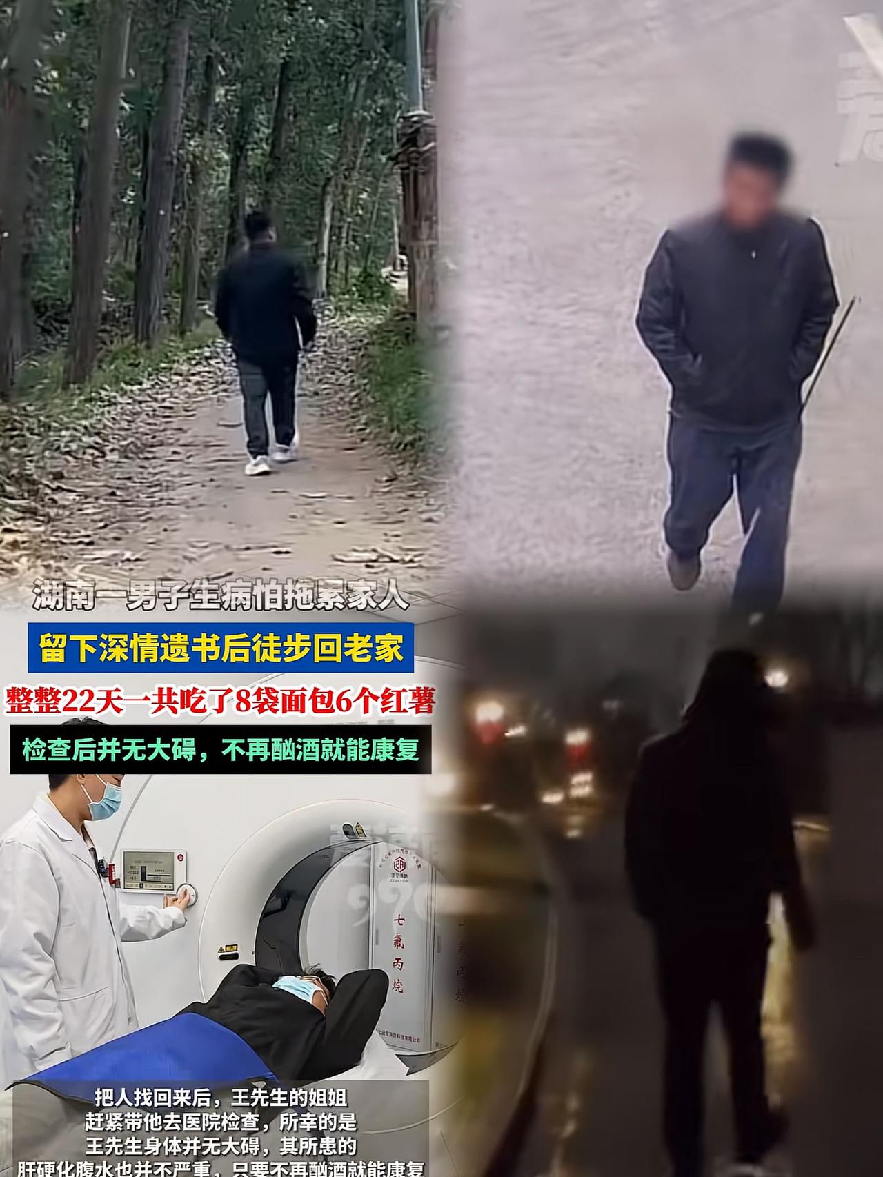 湖南一男子查出肝病怕拖累家人,留下遗书后徒步22天回老家等死,22天只睡了一夜,吃了8袋方便面6个红薯,被找回后再检查:“他的病只要不酗酒就能治好。” 一家人这才又心酸又庆幸。 这男子也太实在了,啥事都自己扛,却忘了家人最在乎的是他的健康和陪伴。 生活中,我们是不是也常这样,遇到难题就想着自己解决,却忽略了身边人的关心和支持?其实,有时候说出来,大家一起面对,问题可能就没那么难了。 你觉得这男子是不是太“傻”了?换做是你,会怎么做呢?快来评论区聊聊你的看法吧!