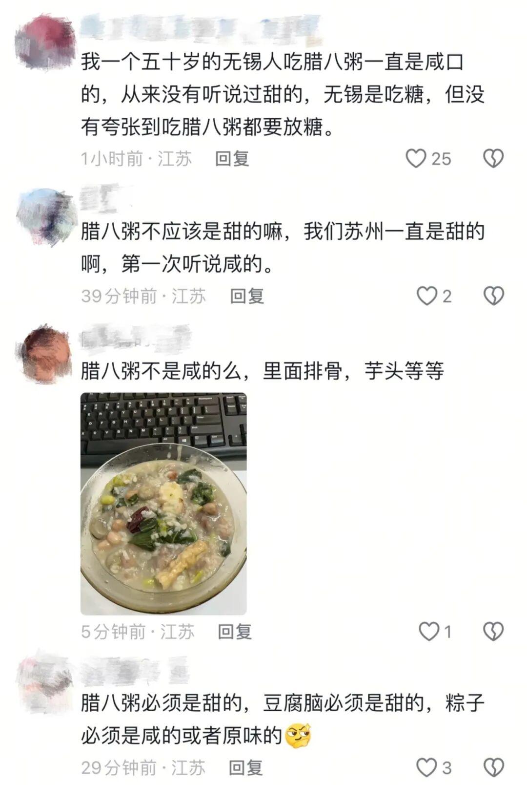 昨天是腊八,你喝粥了吗?除了温暖的粥香,一场关于腊八粥的“甜咸之争”也在江苏网友中悄然兴起——原来,这一碗粥也有南北风味之别! 你可能听说过粽子、豆花的甜咸之争,但腊八粥的“内部分歧”同样精彩。在江苏,各个城市对腊八粥的理解可谓“一城一味”: · 苏州:可甜可咸,十分讲究。甜粥用糯米、赤豆、莲子、桂圆、核桃、红枣等熬制;咸粥则会加入如意菜、长生果,配上胡萝卜、香菇、青菜等,既好吃又讨口彩。 · 无锡:甚至分“寺庙粥”和“家粥”。寺庙供应“素腊八”,用青菜、萝卜、黄豆等熬成;家里则会做“荤腊八”,加入排骨、火腿等,温暖实在。 · 南通:过去富裕人家用糯米配上莲子、红枣、白果等;普通人家则倾向用杂粮搭配芋头、胡萝卜、青菜等,朴实却充满家常味。 · 淮安与徐州:也都延续甜咸两种传统,淮安习惯用五谷杂粮配菜,徐州人则会在粥里加入豆腐皮、笋丝等做成咸粥,或是用玫瑰花、蜜枣等调成甜粥,煮好后还不忘分享给邻里。 有意思的是,这场讨论还引出不少网友的调侃:“说好苏锡常一家,怎么腊八粥口味还不统一?”其实在我看来,这恰恰反映了饮食文化的有趣与多元。一碗粥的背后,不只是一张食材清单,更是一方水土的生活记忆与节庆温情。 甜也好,咸也罢,并没有高下之分。就像生活本身,不同的风味调和在一起,才构成真实而温暖的日常。腊八粥的包容性或许正在于此——它允许依口味自选食材,也容纳着不同家庭的习惯与传统。 昨天你家喝的是甜粥还是咸粥?用了哪些“秘密食材”?欢迎在评论区分享你家的腊八味,也让我们一起聊聊食物里的乡土与人情。