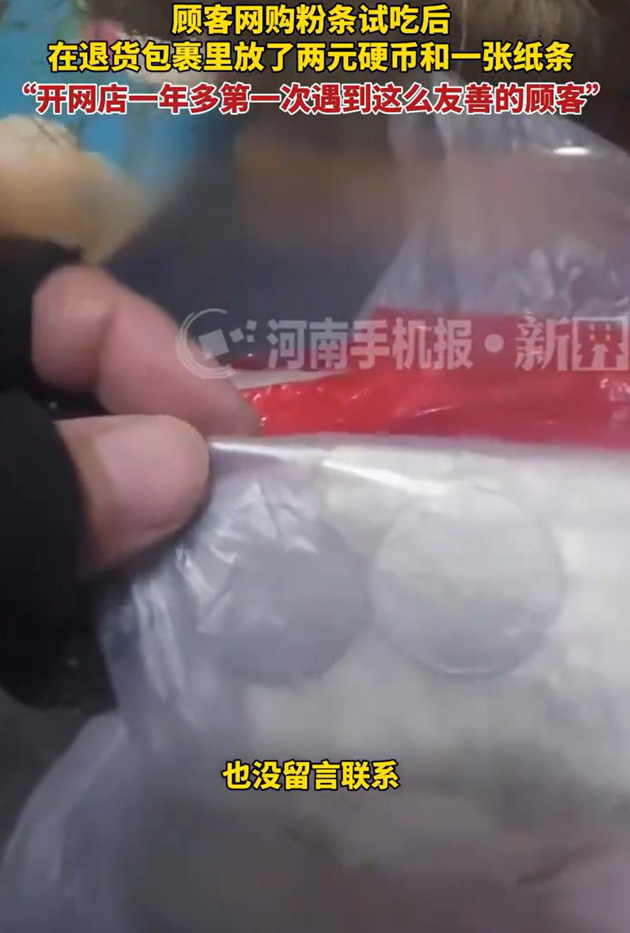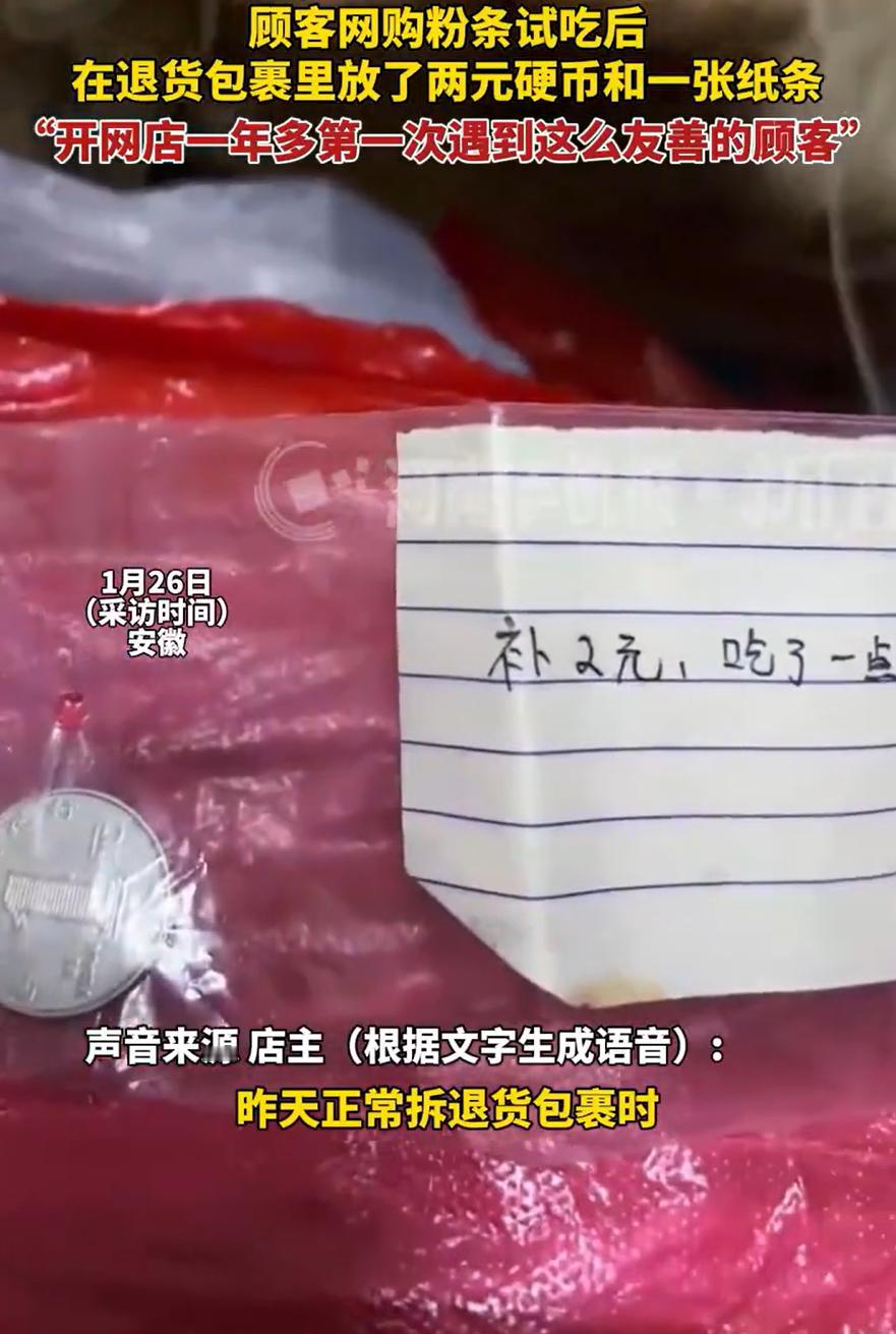 这样的客户全国罕见!安徽,一位顾客网购了一份粉条,但收到货第二天就进行了退货退款,结果商家在收到退回的商品时,发现里面有两块钱硬币和一张纸条,看了才知道,原来对方试吃了一点,然后把钱给补回来了,这可把店家感动的不行 店家介绍,当时看到客户退货也没有在意,毕竟做网店商家的,客户正常收货退货都很正常,而且一份粉条的钱也不多,可在拆退货包裹时,这名顾客给了他一个大大的惊喜 在包裹里发现有一个小塑料袋,里面有两个一元的硬币,还有一张小纸条,上面就写了几个字:补2元,吃了一点 短短几个字,却让店家心里暖暖的,他连忙查询店铺留言,发现对方也没有说过话,自己开网店一年多了,这么友善的客户还是第一次见到 这事听起来很小,却让人觉得心里有点暖。线上交易时,彼此看不见摸不着,更容易产生计较和猜疑。可这位顾客用最朴素的方式,做了一个小小的示范,我试了一点,觉得不合适退,但试吃的部分,我把钱补上 这不是两块钱的事,而是一种自觉。商家卖的是粉条,顾客买的是需要,交易没达成,但彼此的尊重达成了。很多人退货时未必想到这个层面,总觉得平台有规则,商家有运费险,流程允许就行。但这位顾客在规则之外,还多考虑了一步:不占便宜,不添麻烦 反观,那些买完衣服穿了几天不摘吊牌然后再退货的人,和吃了东西仅退款的人,差距一下就显现出来了